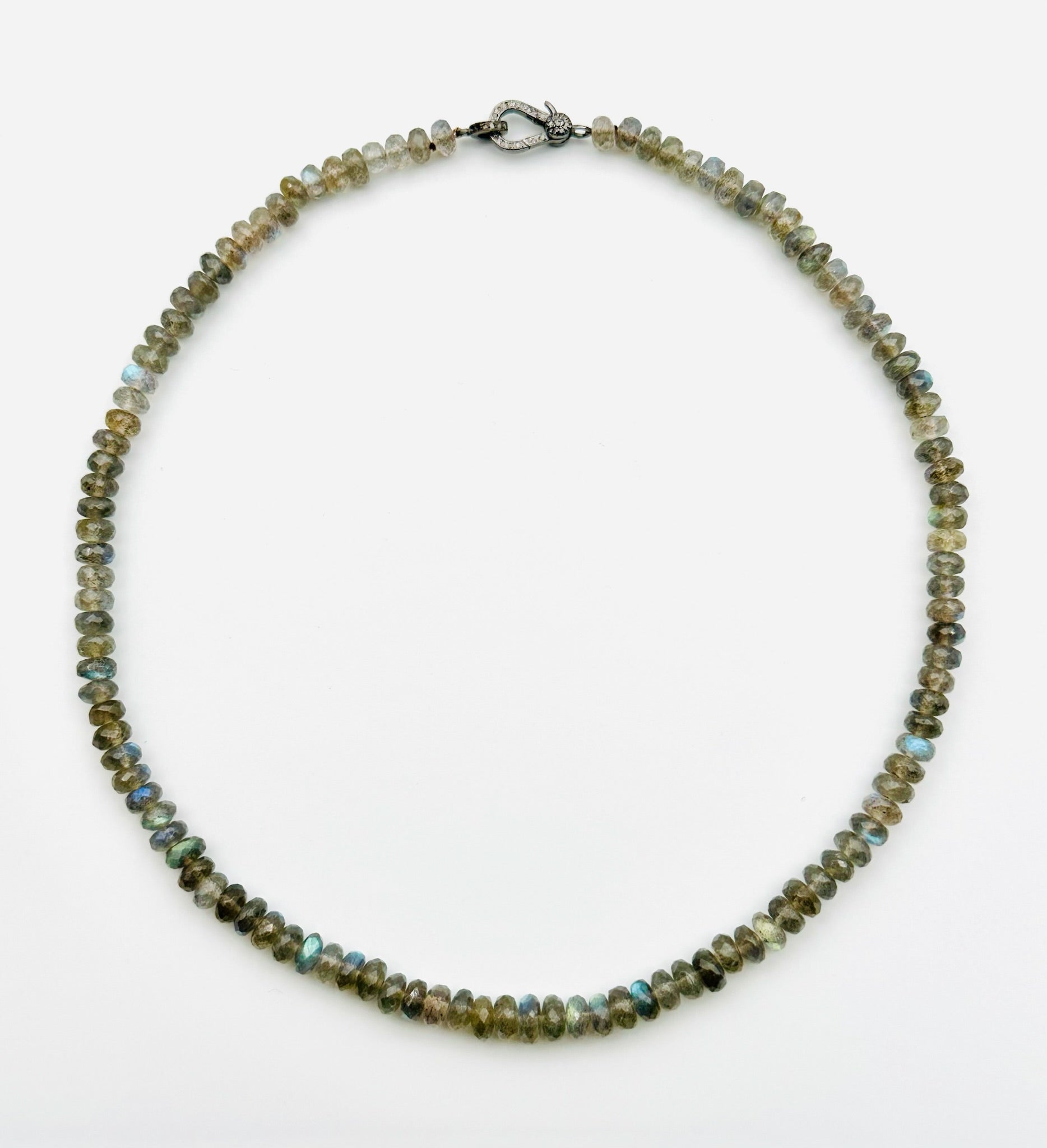 4-6mm Faceted Labrodite Rondelle Graduated Necklace with Diamond Teardrop Shaped Clasp, Sterling Silver, 16" length
