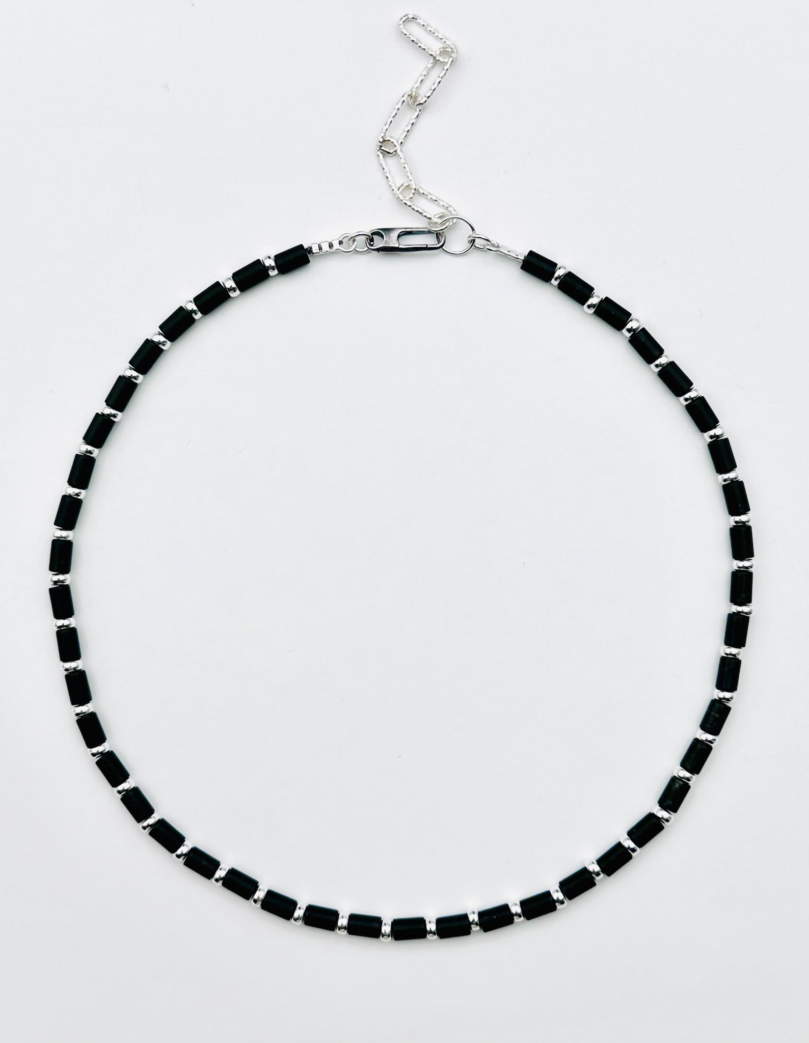 Black Matte onyx Tube Shaped Necklace with Sterling Silver Rondelles, Clasp and Extension Chain, 16" length