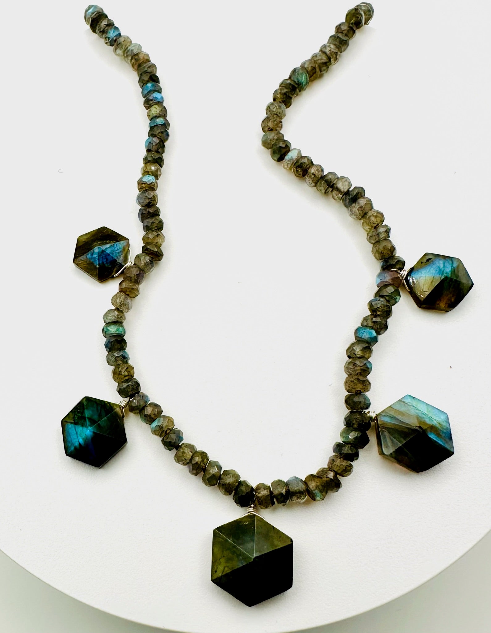 Faceted Labradorite Hexagon Shaped Necklace with Labradorite Rondelle, Sterling Silver, 16" length + Extension
