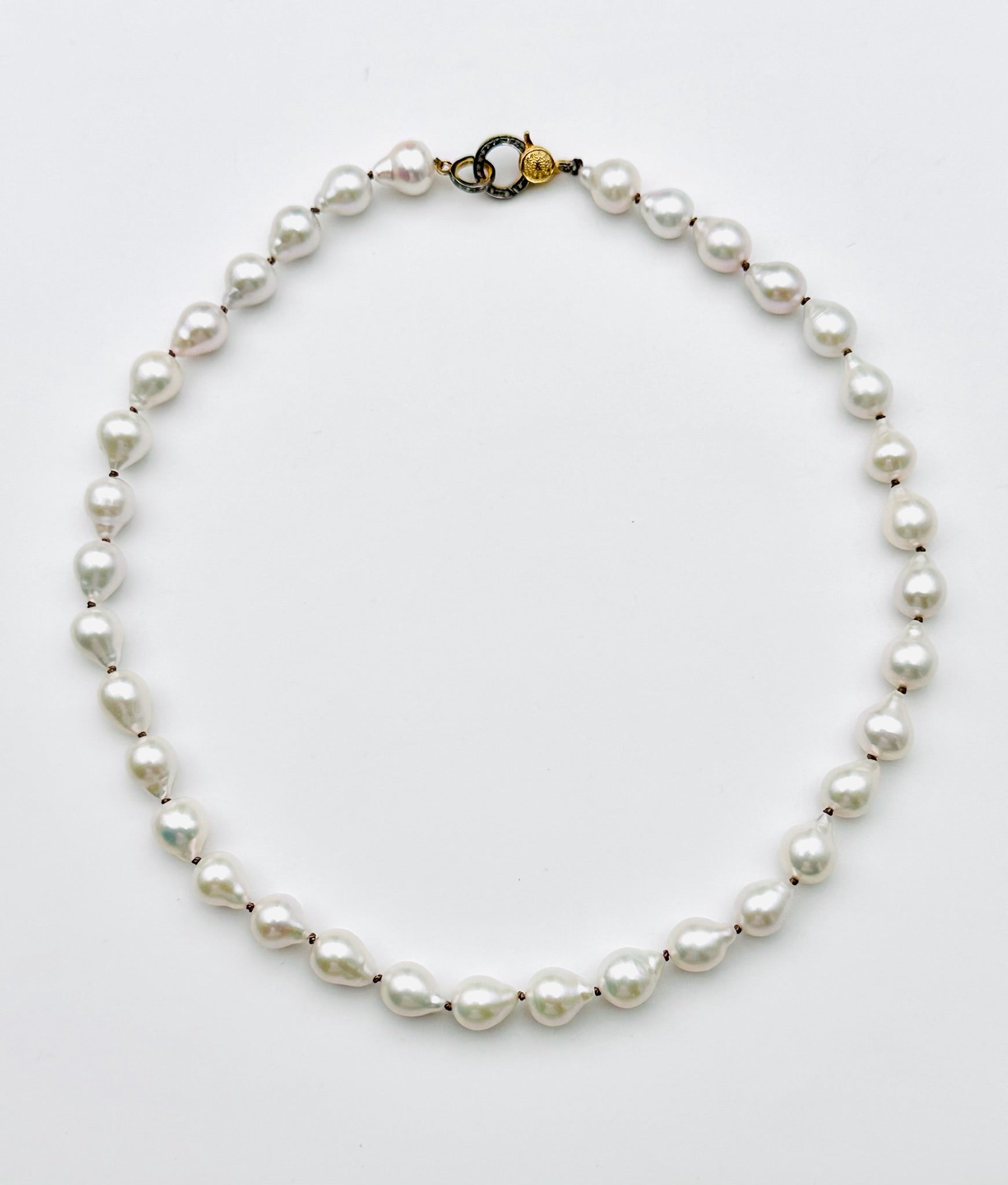 17" Small White Baroque Pearl Necklace with Two Tone Vermeil and Sterling Silver Diamond Clasp