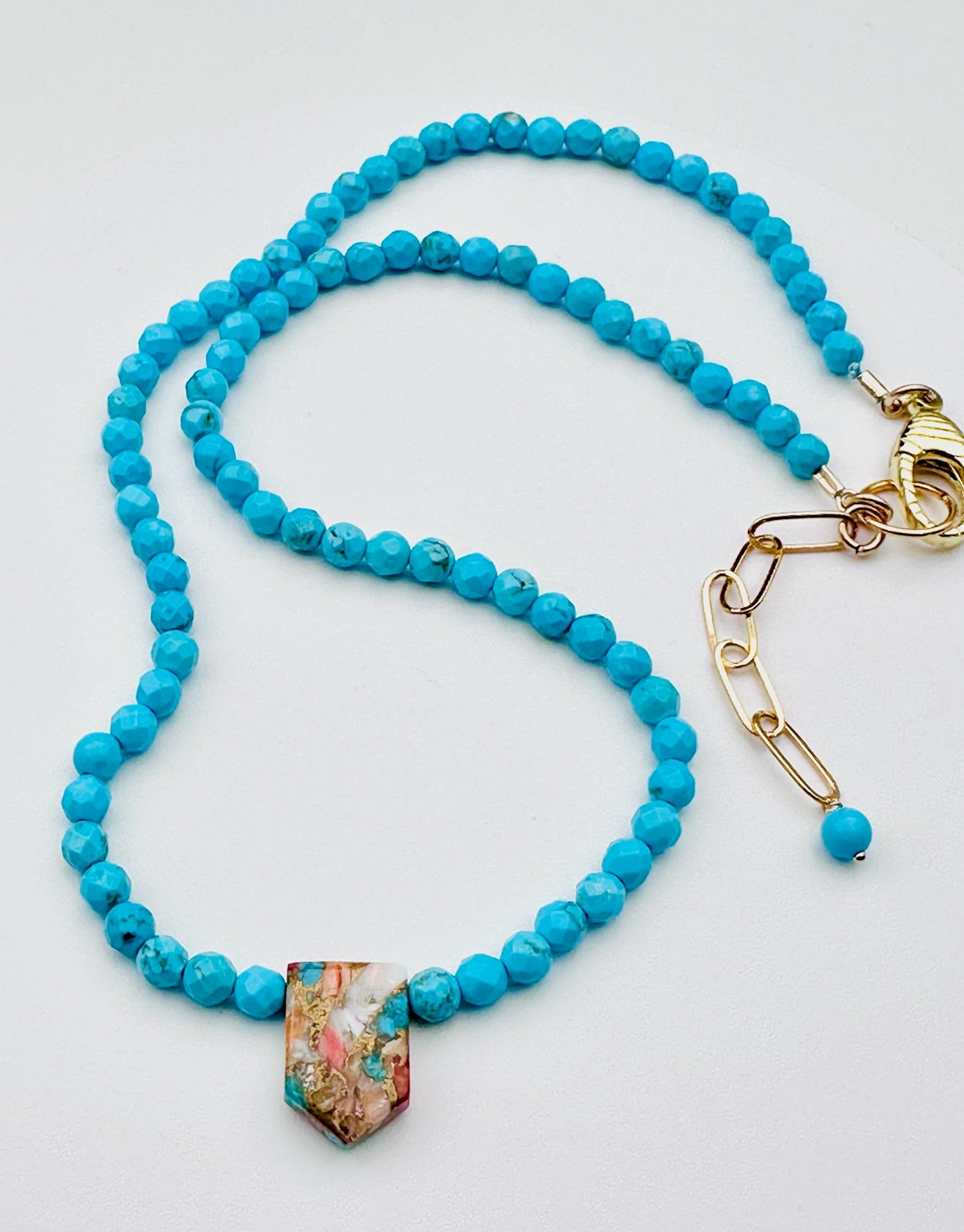 17" Turquoise Necklace with Oyster Turquoise Pentagon Shaped Briolette and Gold Fill Clasp