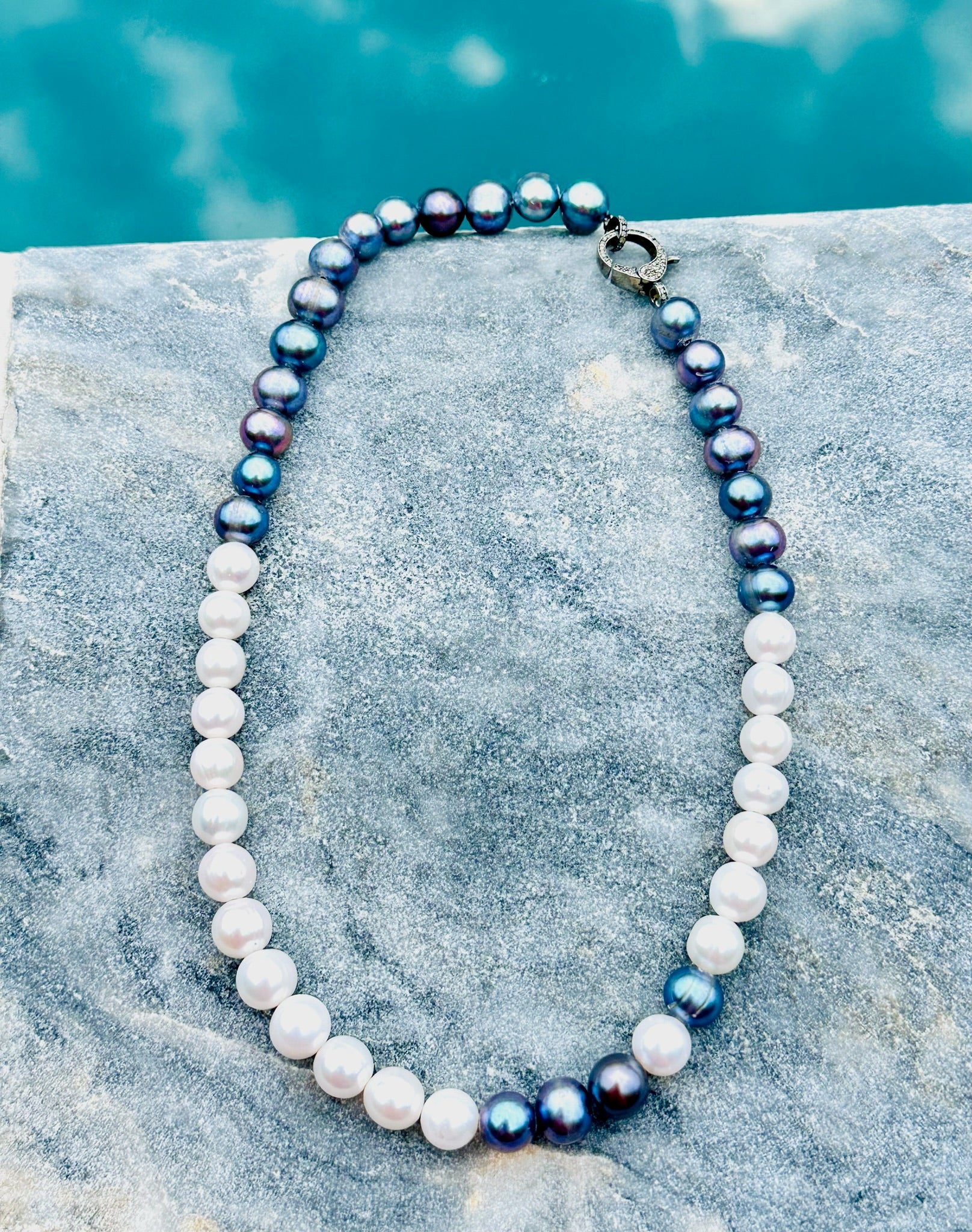10-11 White and Peacock Freshwater Pearl Combination Necklace with Sterling Silver Diamond Clasp, 18" length