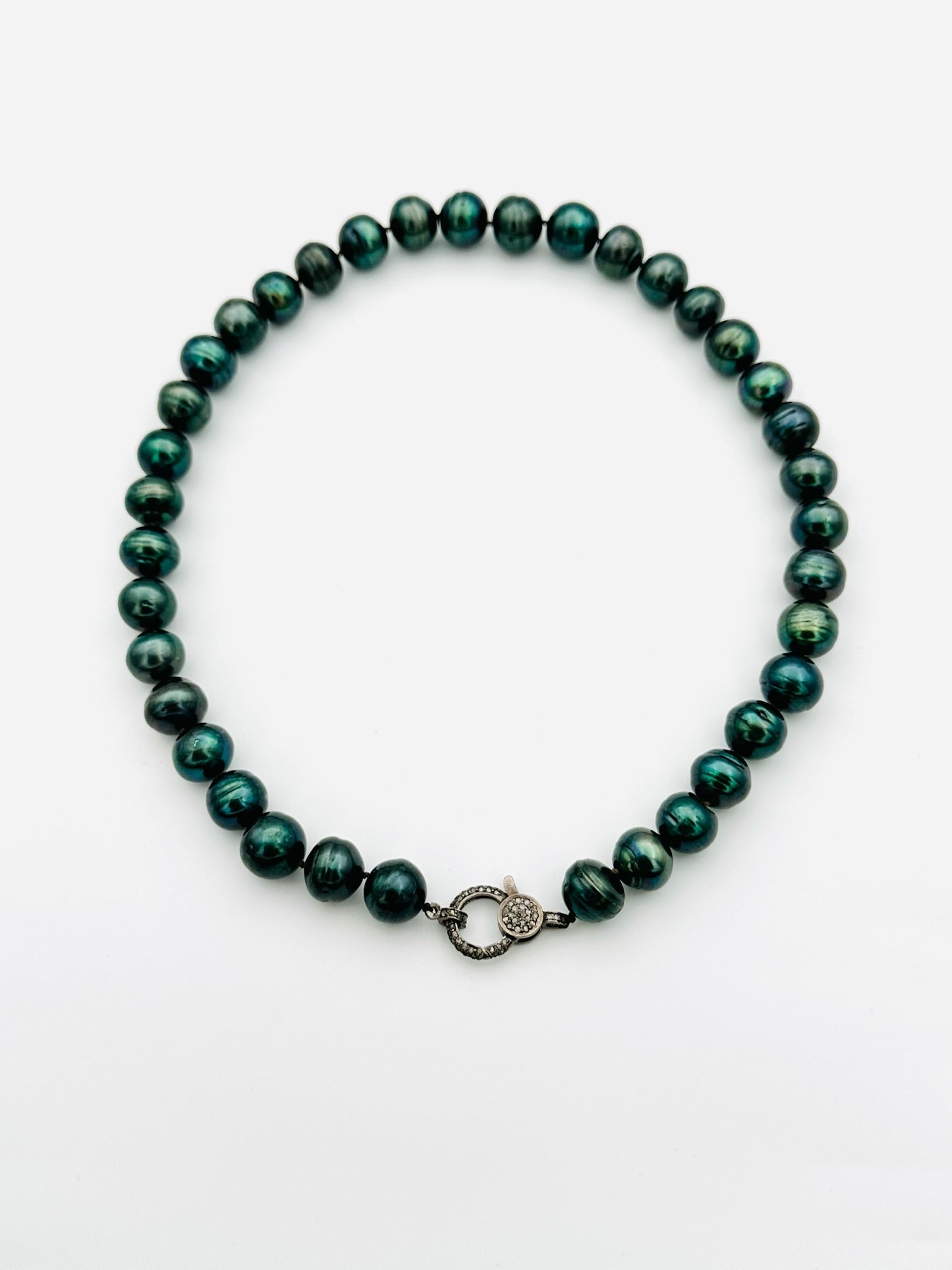 10mm Green Akoya Pearl with Sterling Silver Diamond Clasp, 18" Length