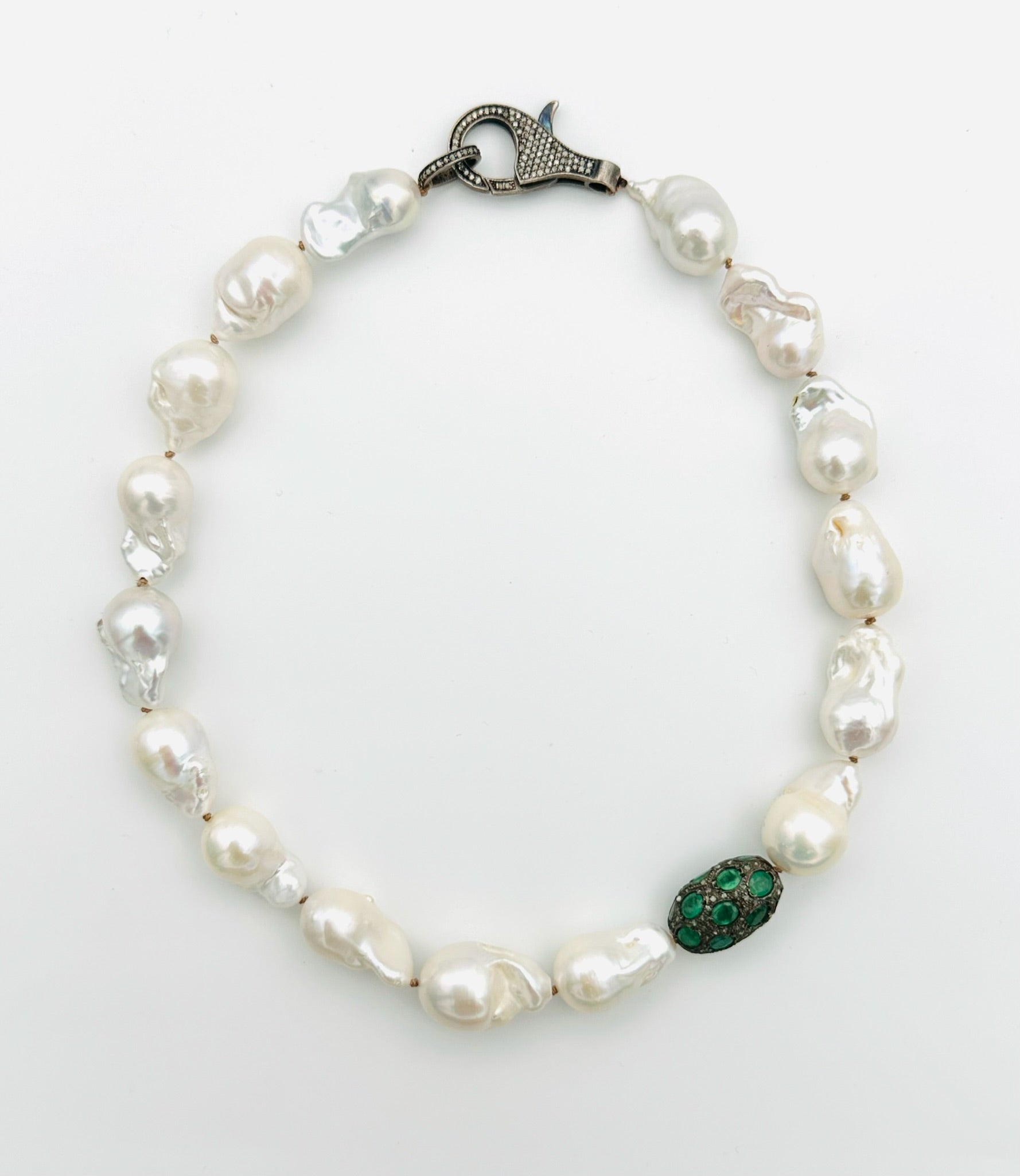 16mm Freshwater White Baroque Short Necklace with Emerald and Diamond Bead and Large Diamond Sterling Silver Clasp, 18" Length