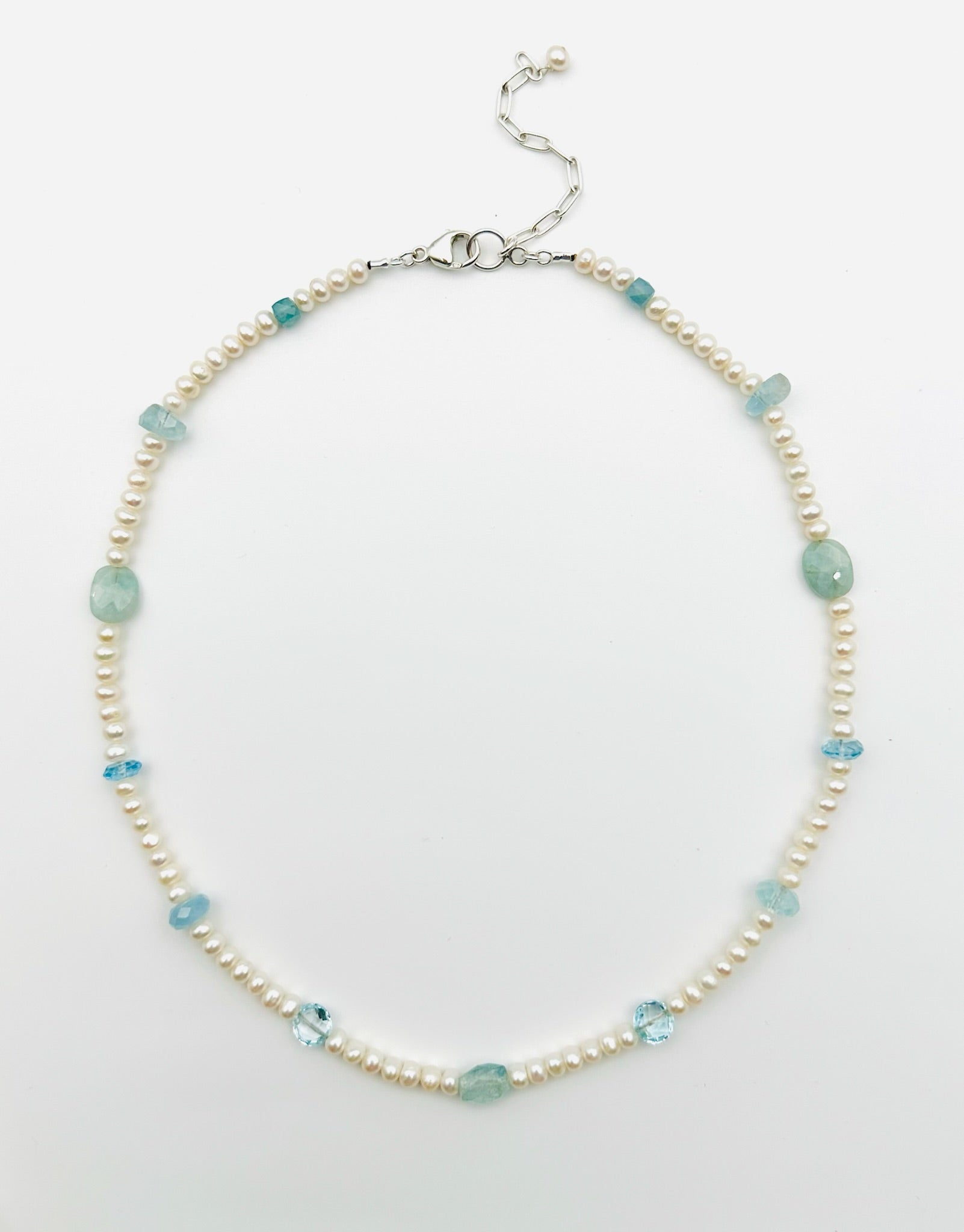 4mm White Freshwater Pearl Aquamarine and Blue Topaz Combo, Sterling Silver, 18" Length + 2" Extension Chain