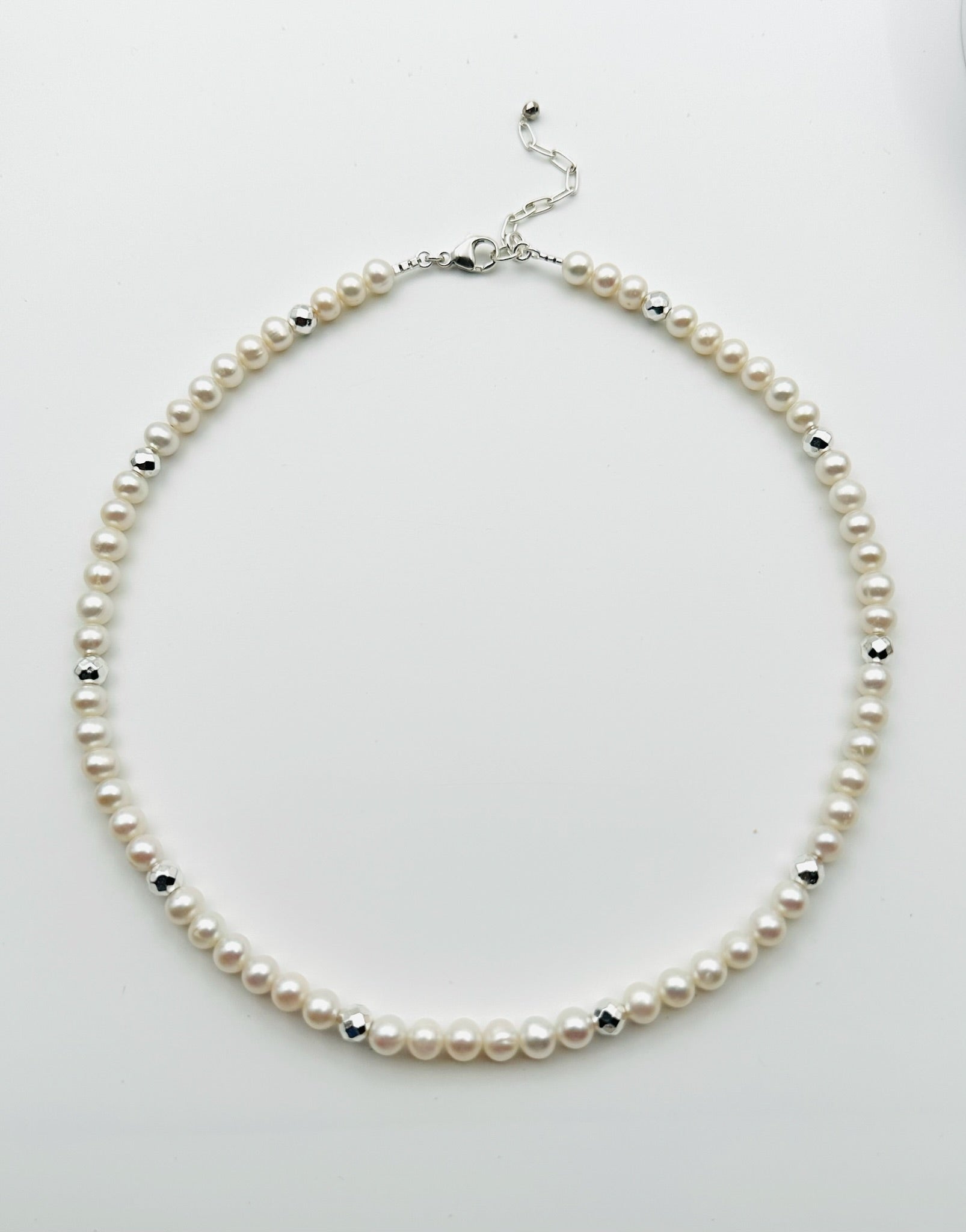 6mm Freshwater Pearl Necklace with Faceted White Pyrite Balls, Sterling Silver, 18" length Plus 2" length Extension Chain