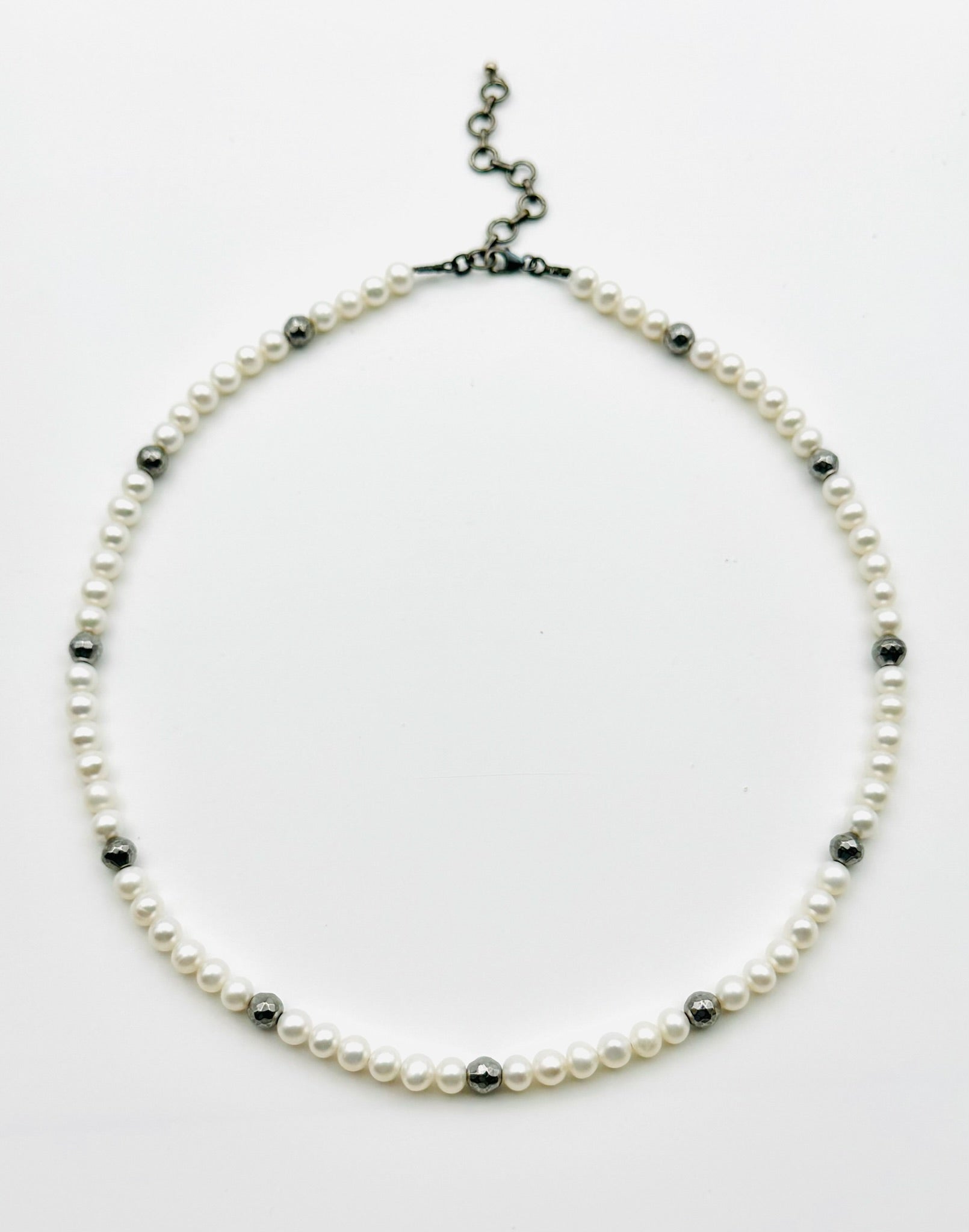 6mm Freshwater Pearl Necklace with Rhodium Faceted Pyrite Balls, 18" length Plus 2" length Extension Chain