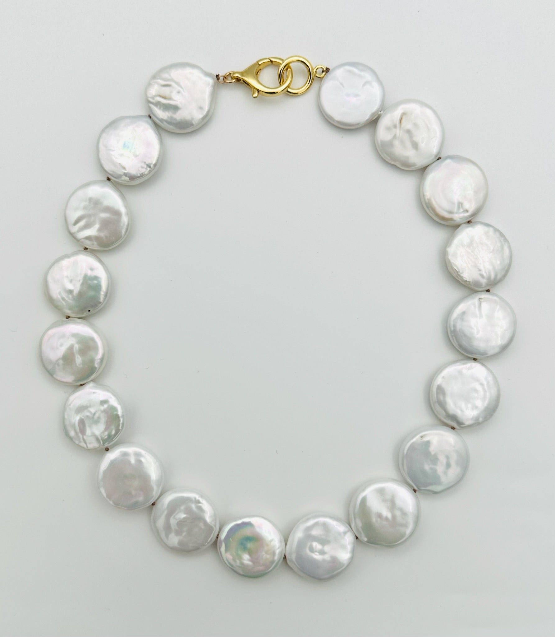 AAA 23mm Large White Coin Necklace without spacing and a Gold Faceted Clasp, 18" Length
