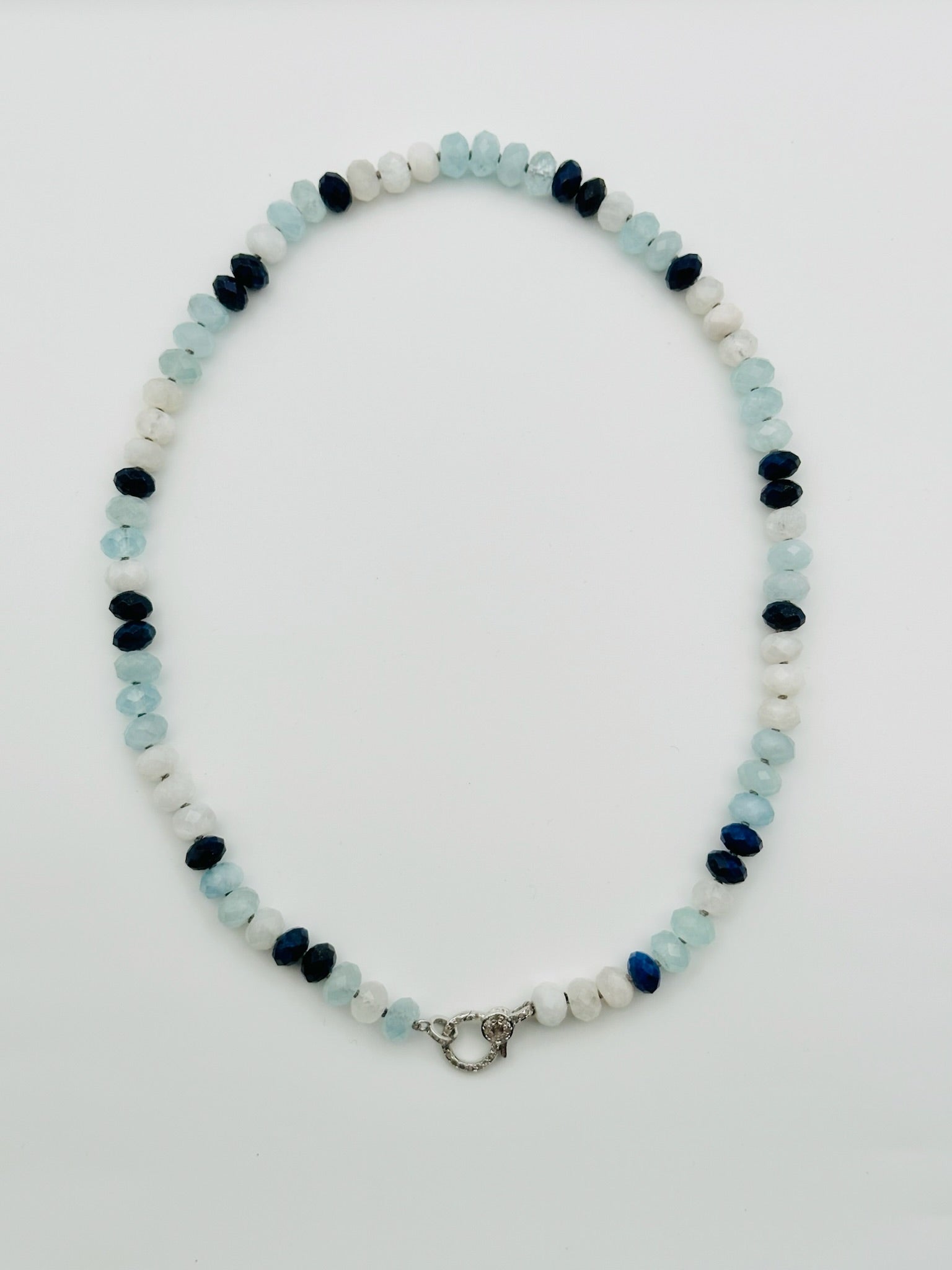 Aquamarine, Moonstone, Lapis Necklace with Sterling Silver Diamond Clasp, 18" Length