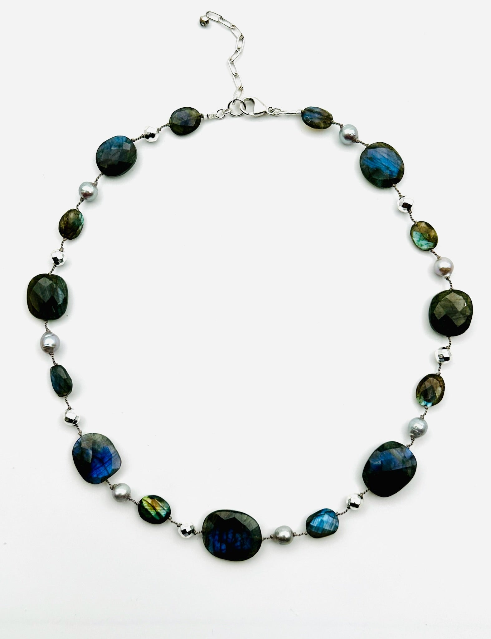 18" Faceted Labradorite Pyrite and Grey 7mm Freshwater Pearl Baroque Combination Necklace with Sterling Silver Clasp