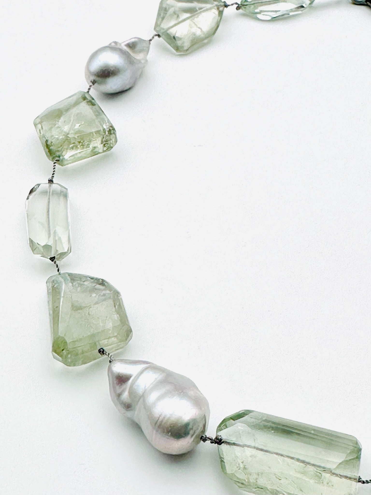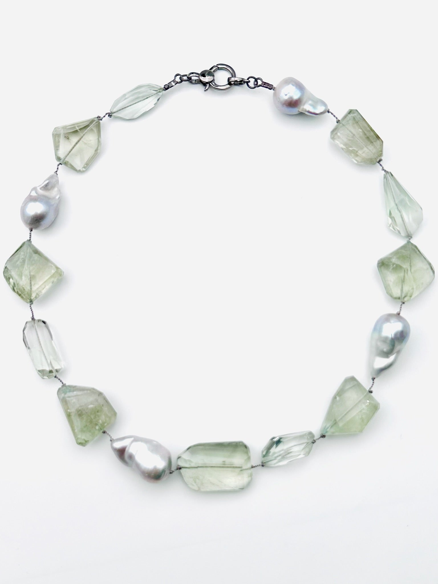 18" Faceted Organic Shaped Green Amethyst and Grey Baroque Pearl Necklace
