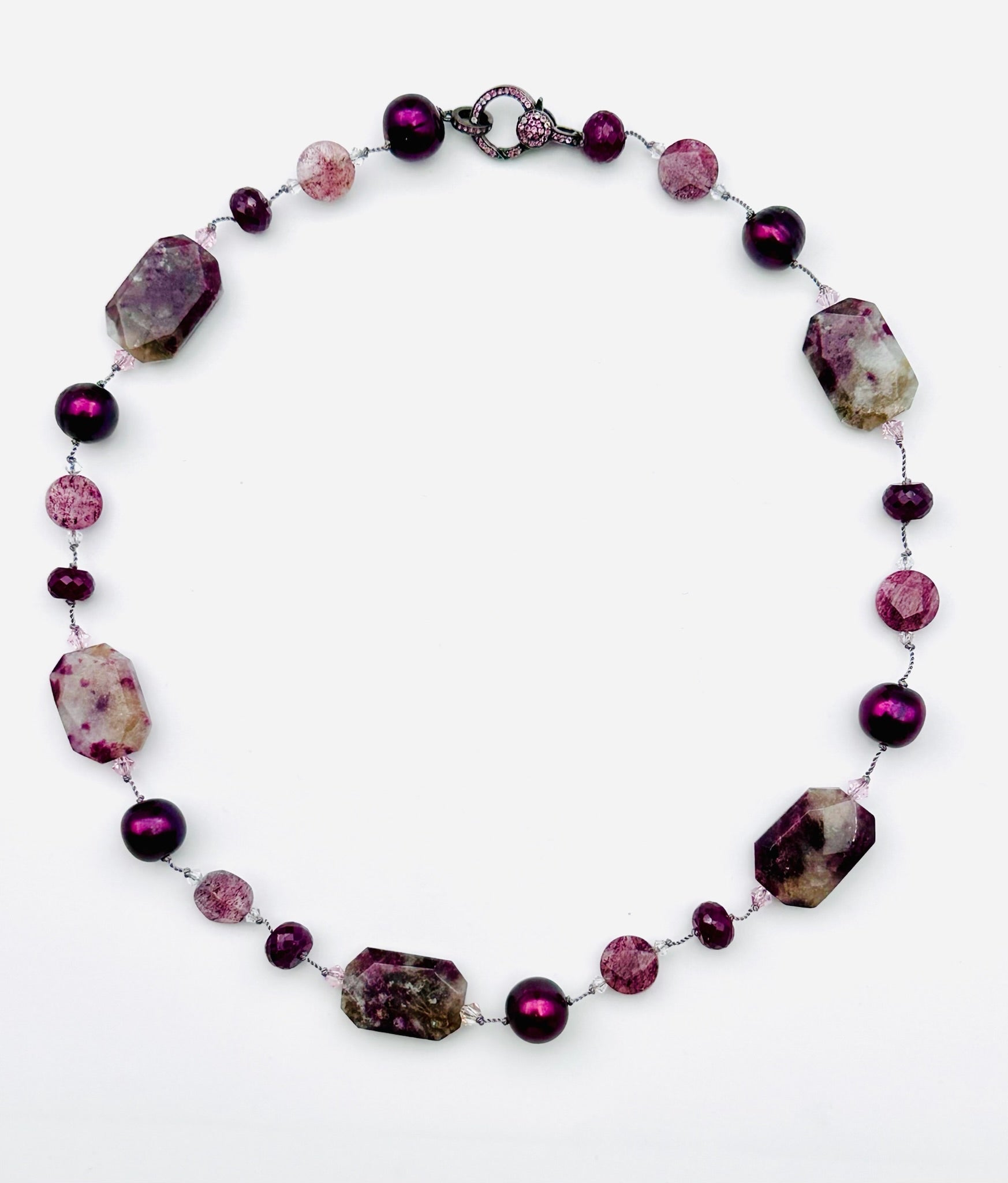 18" Faceted Ruby, Tourmaline, Strawberry Quartz and Freshwater Pearl Necklace with Sterling Silver Tourmaline Clasp