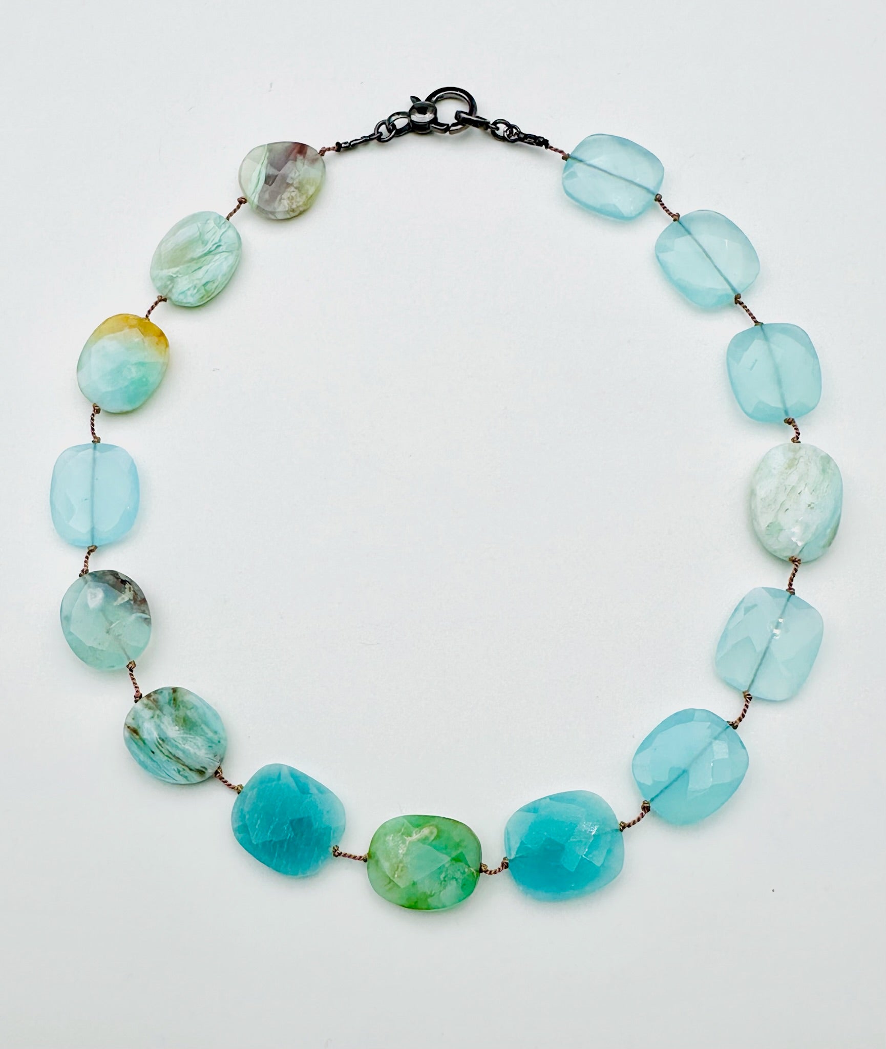 Flat Faceted Peruvian Opal and Aqua Chalcedony Mixed Necklace with Sterling Silver Clasp, 18" length