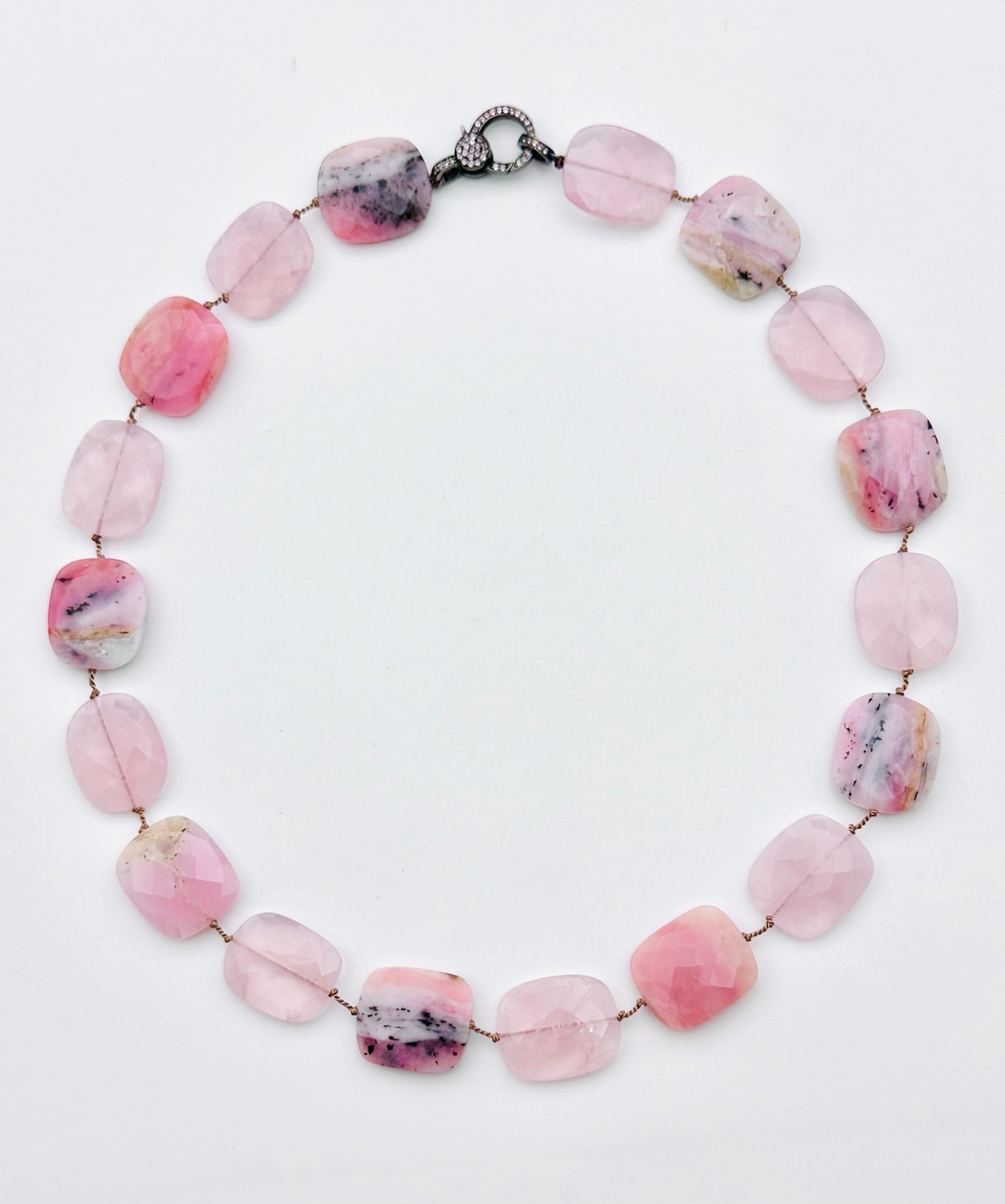 Flat Faceted Pink Opal and Rose Quartz Necklace with Sterling Silver Multicolor Spinel Clasp, 18" length