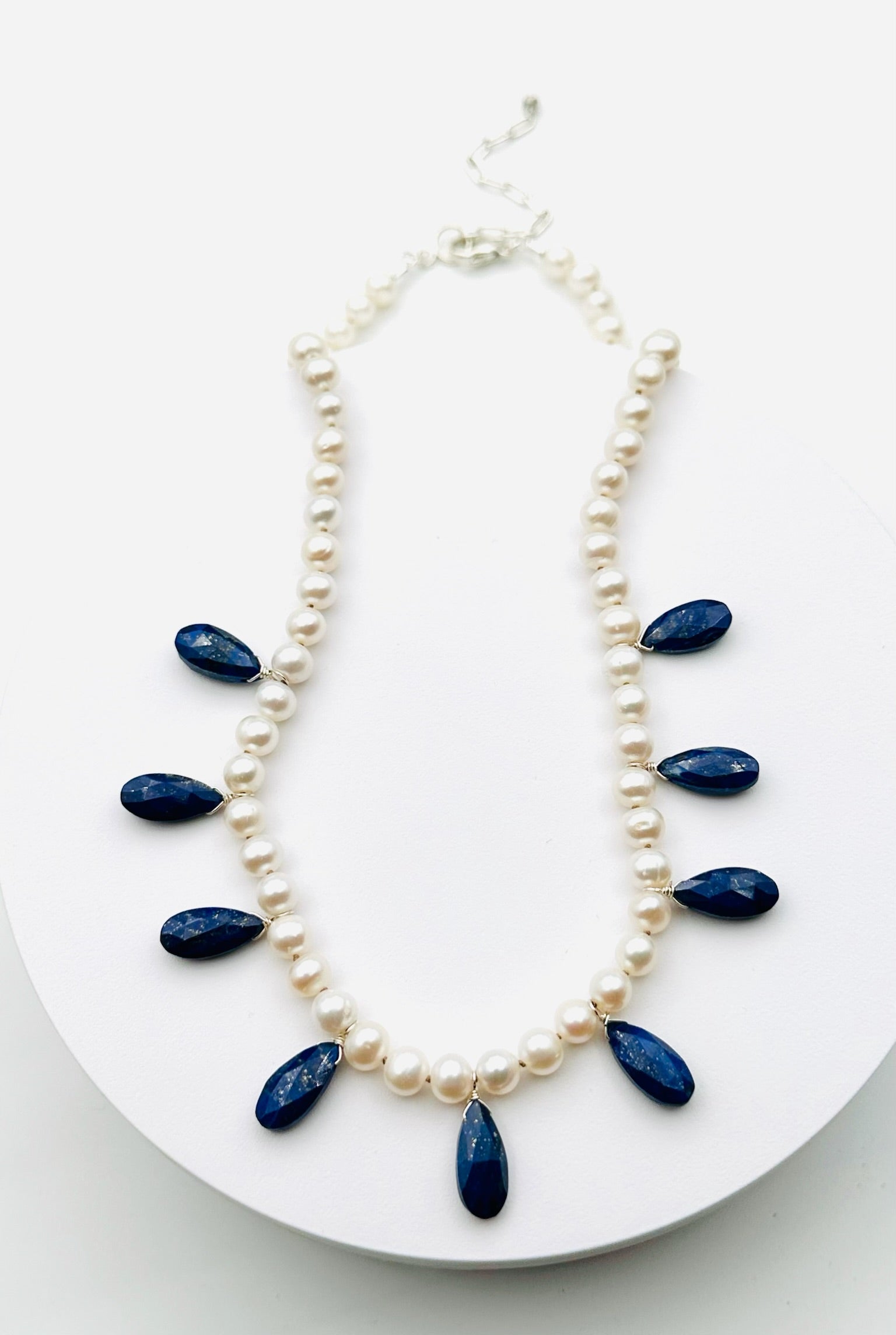 Freshwater Pearl and 6mm Lapis with Sterling Silver, 18" Length