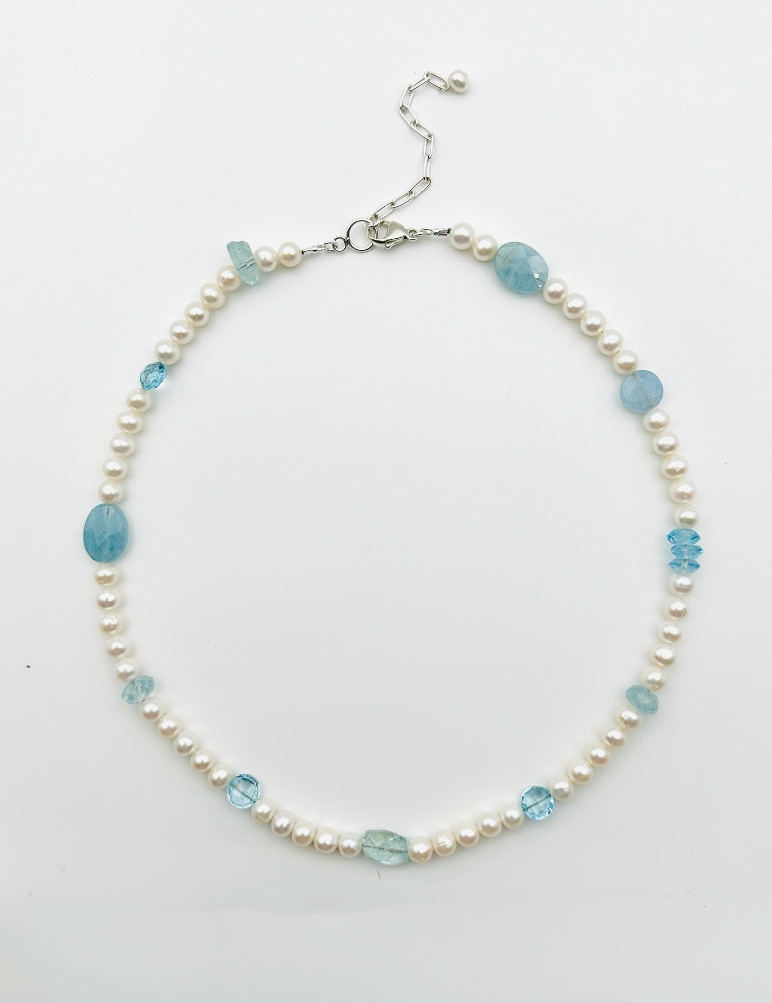 Freshwater Pearl Aquamarine and Blue Topaz Combo, Sterling Silver, 18" Length + 2" Extension Chain
