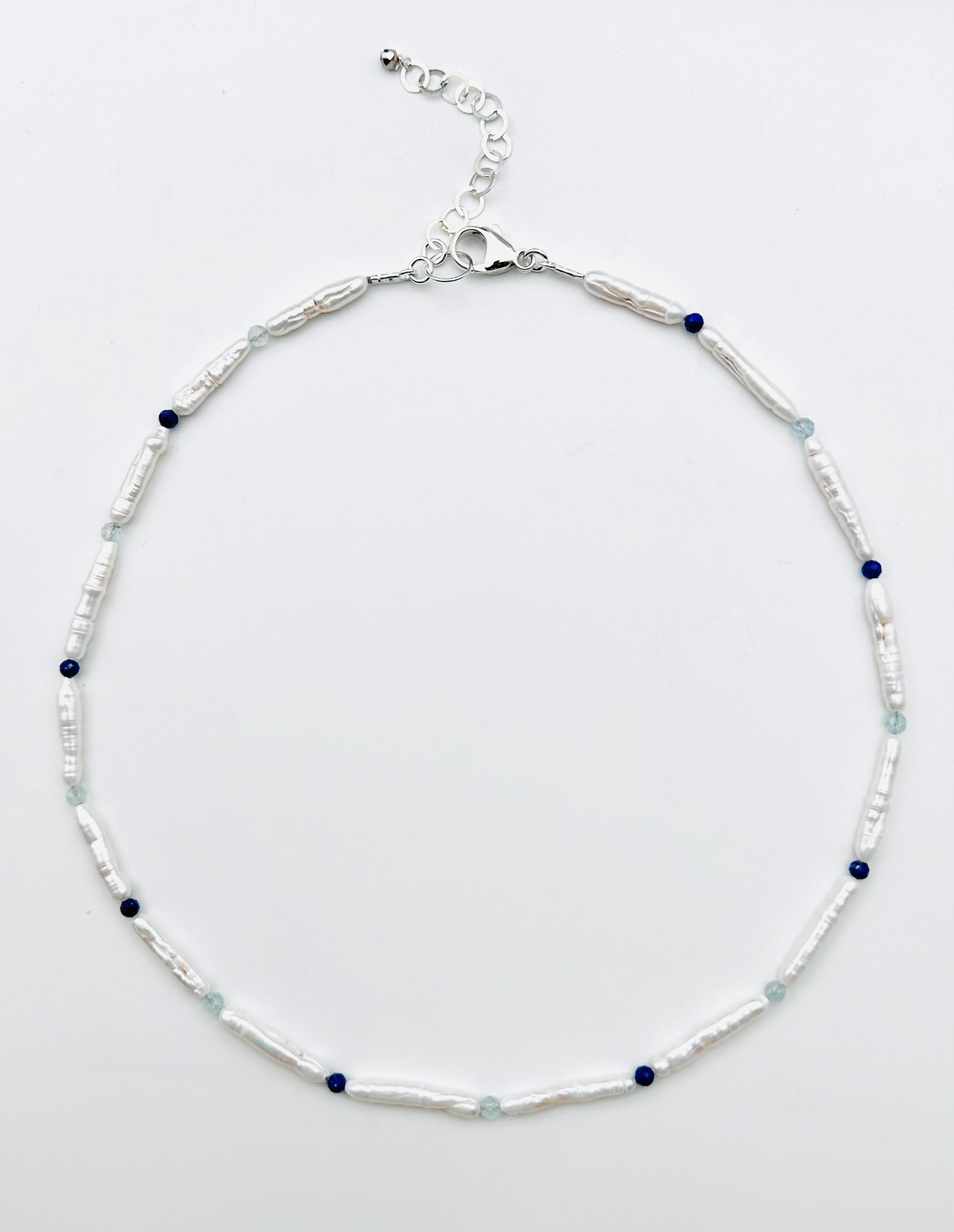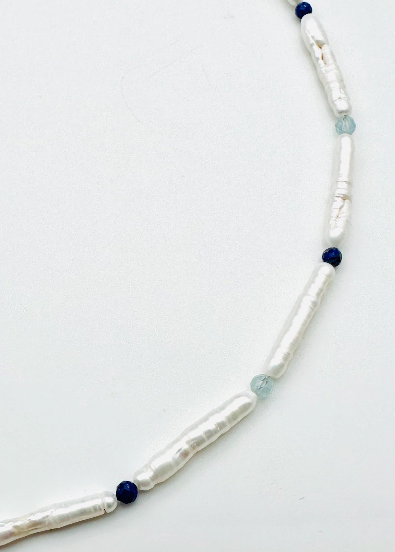 Freshwater Stick Pearl with Aquamarine and Lapis and Sterling Silver Clasp, 18" length