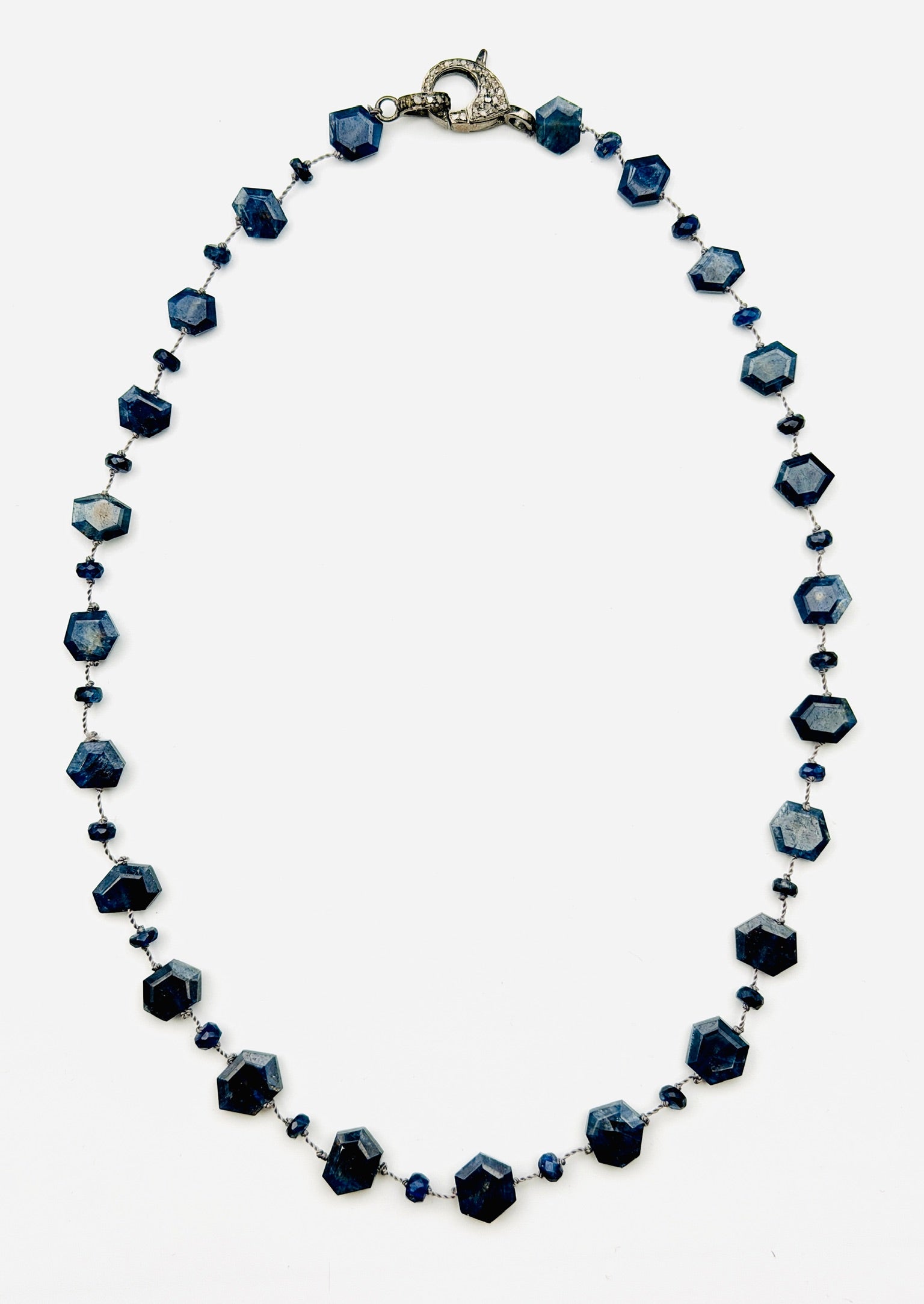 Hand Cut Hexagon Blue Sapphire and Kyanite Mix Necklace with Sterling Silver Diamond Clasp, 18" length