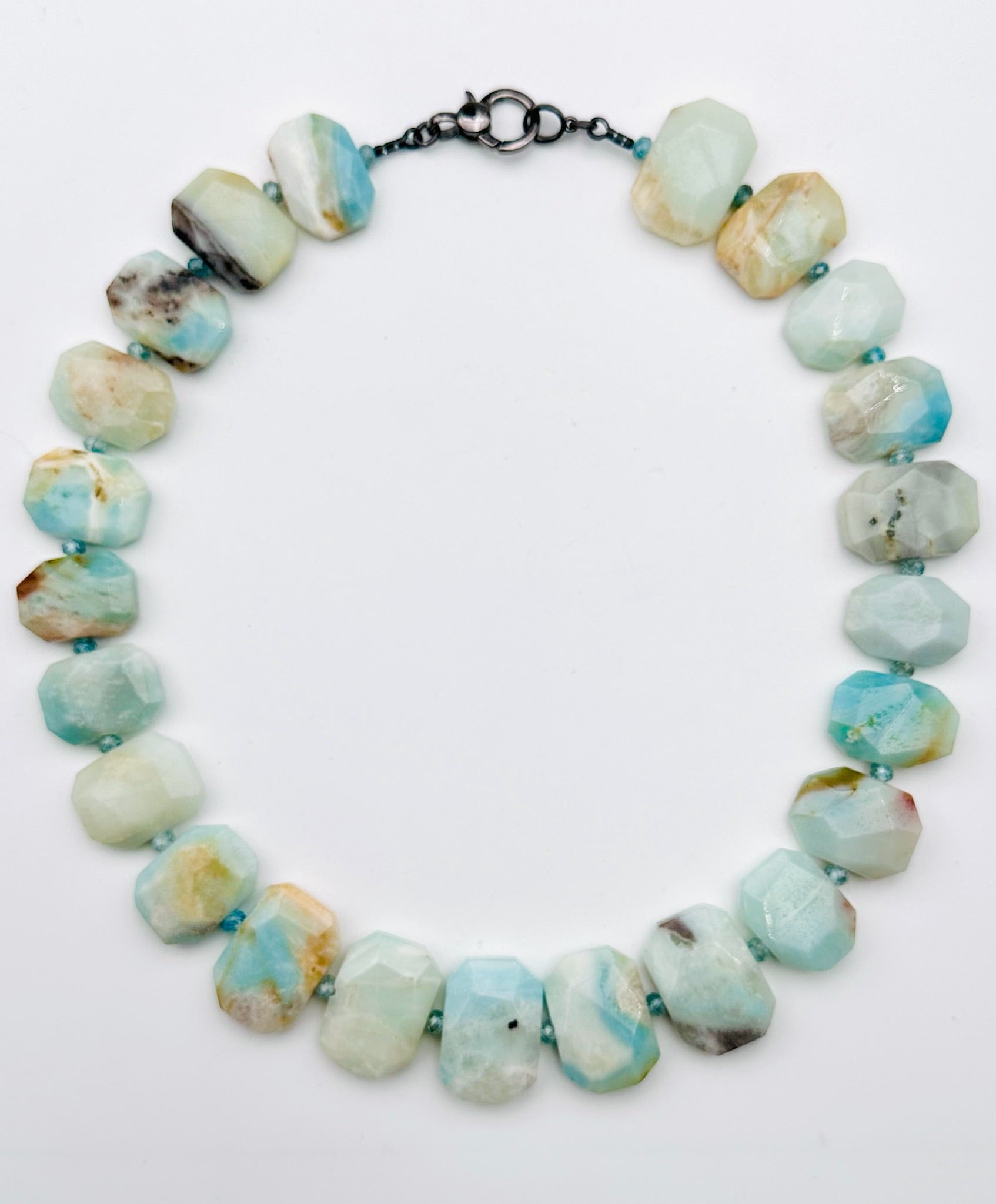Large Faceted Amazonite and Natural Blue Zircon Necklace with Sterling Silver Clasp, 18" length