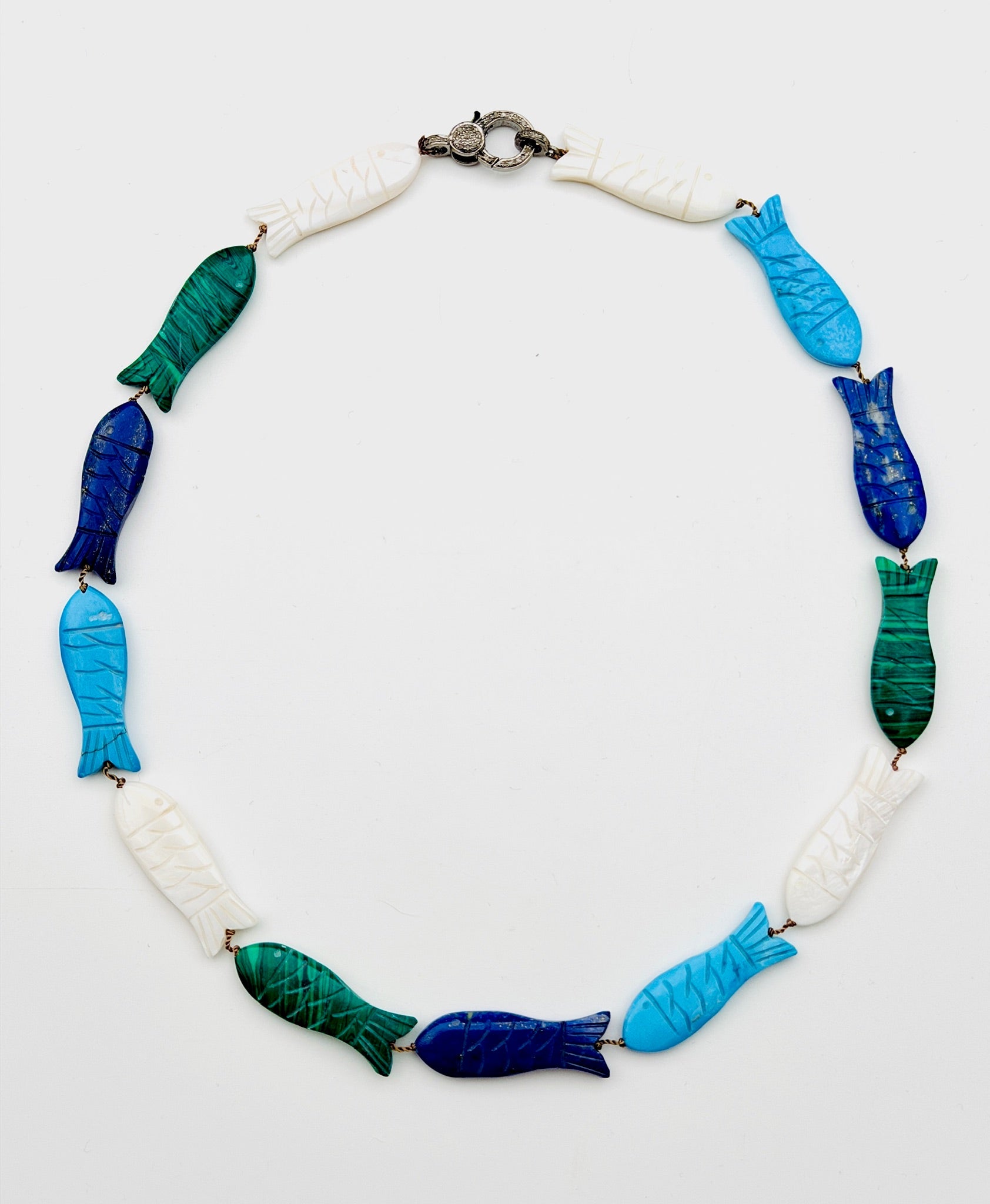 Large Hand-Carved Mother of Pearl, Lapis, Turquoise, and Malachite Necklace with Sterling Silver and Diamond Clasp, 18" length