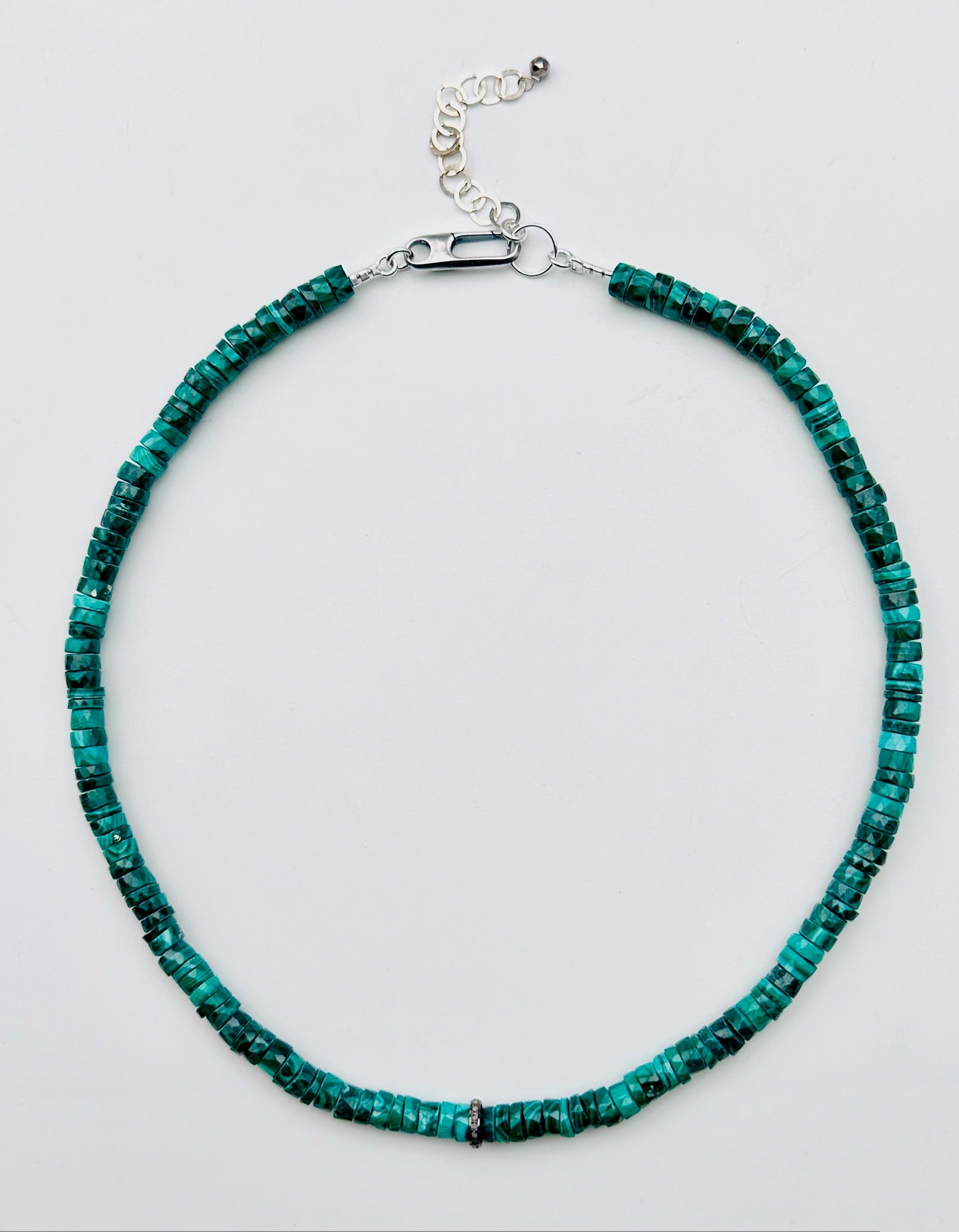 18" Malachite Heishi Necklace with Sterling Silver Diamond Rondelle and Sterling Silver Clasp