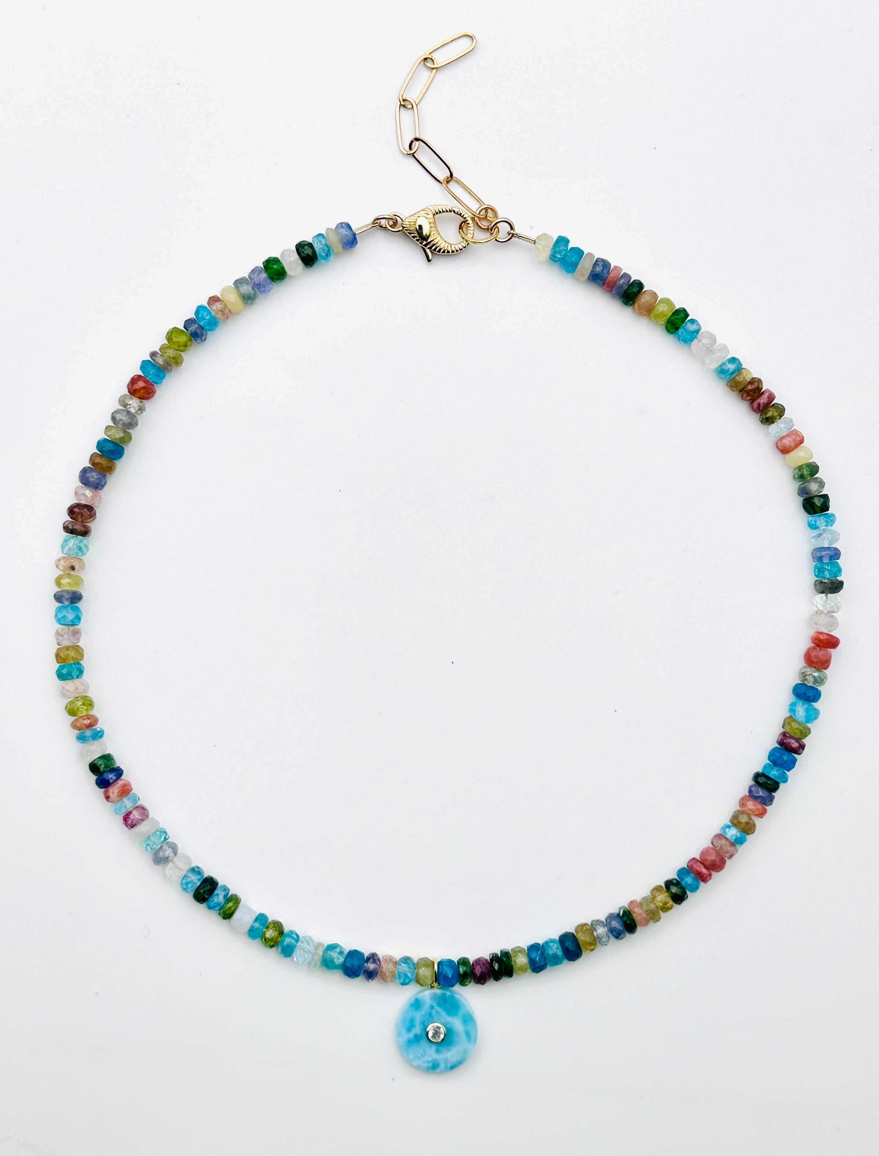 Multi Color Gemstone Rondelle Necklace with a Pendant and An 18K Gold Fill Clasp, 18" length