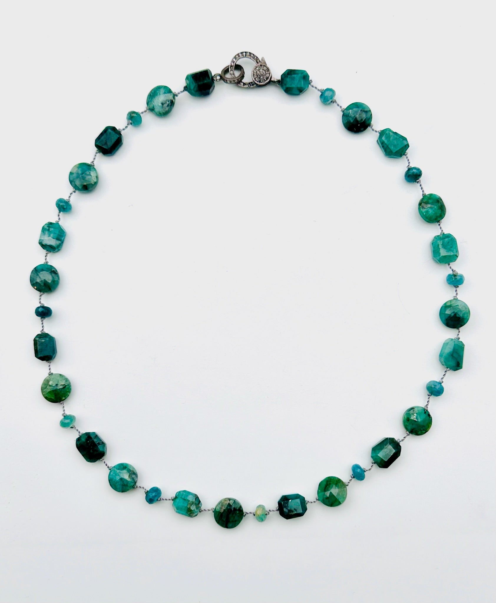 Multi Shape Raw Emerald Necklace with Sterling Silver Diamond Clasp, 18" length