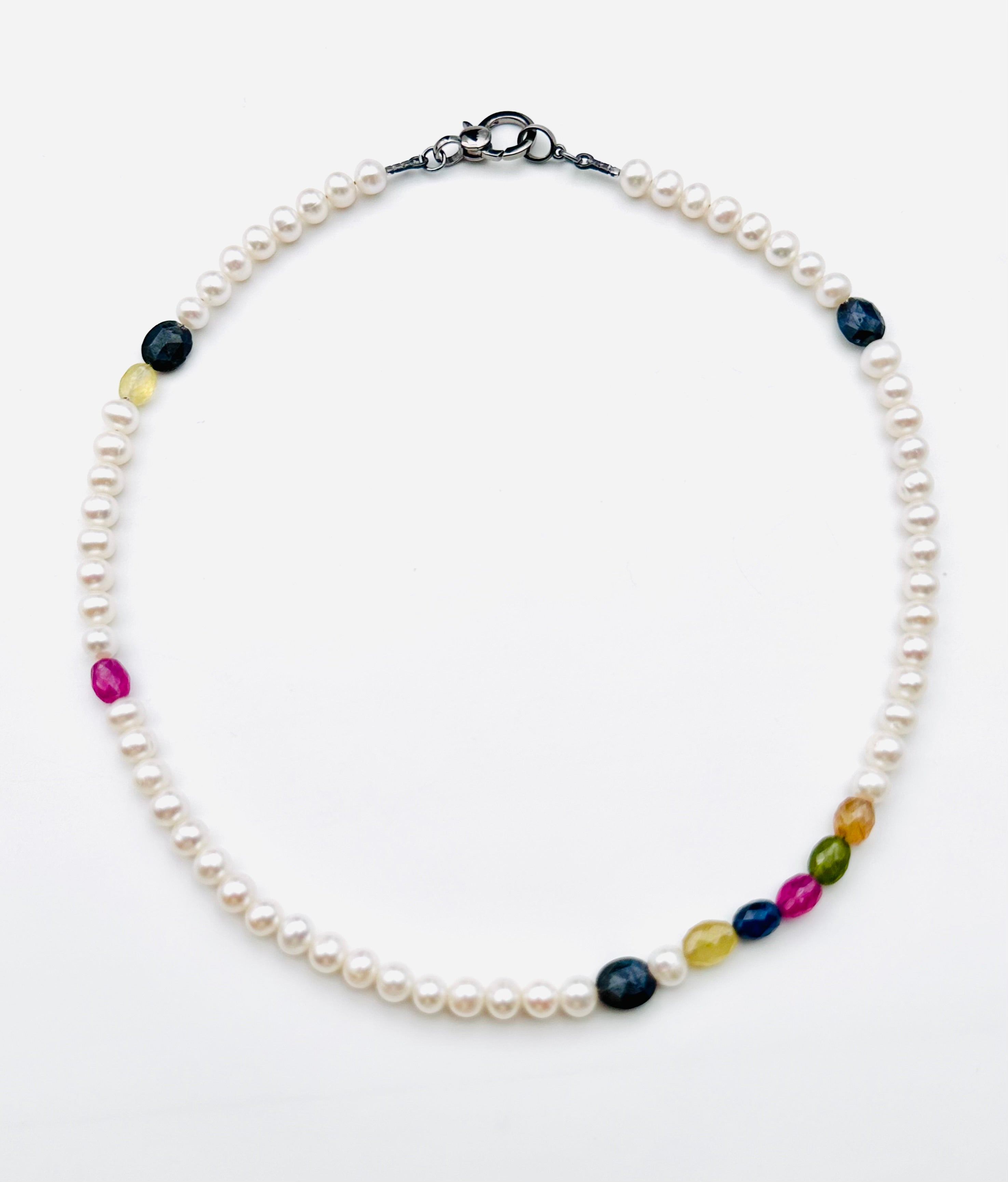 Multicolor Sapphire and 6mm White Freshwater Pearl Necklace with Sterling Silver Clasp, 18" length
