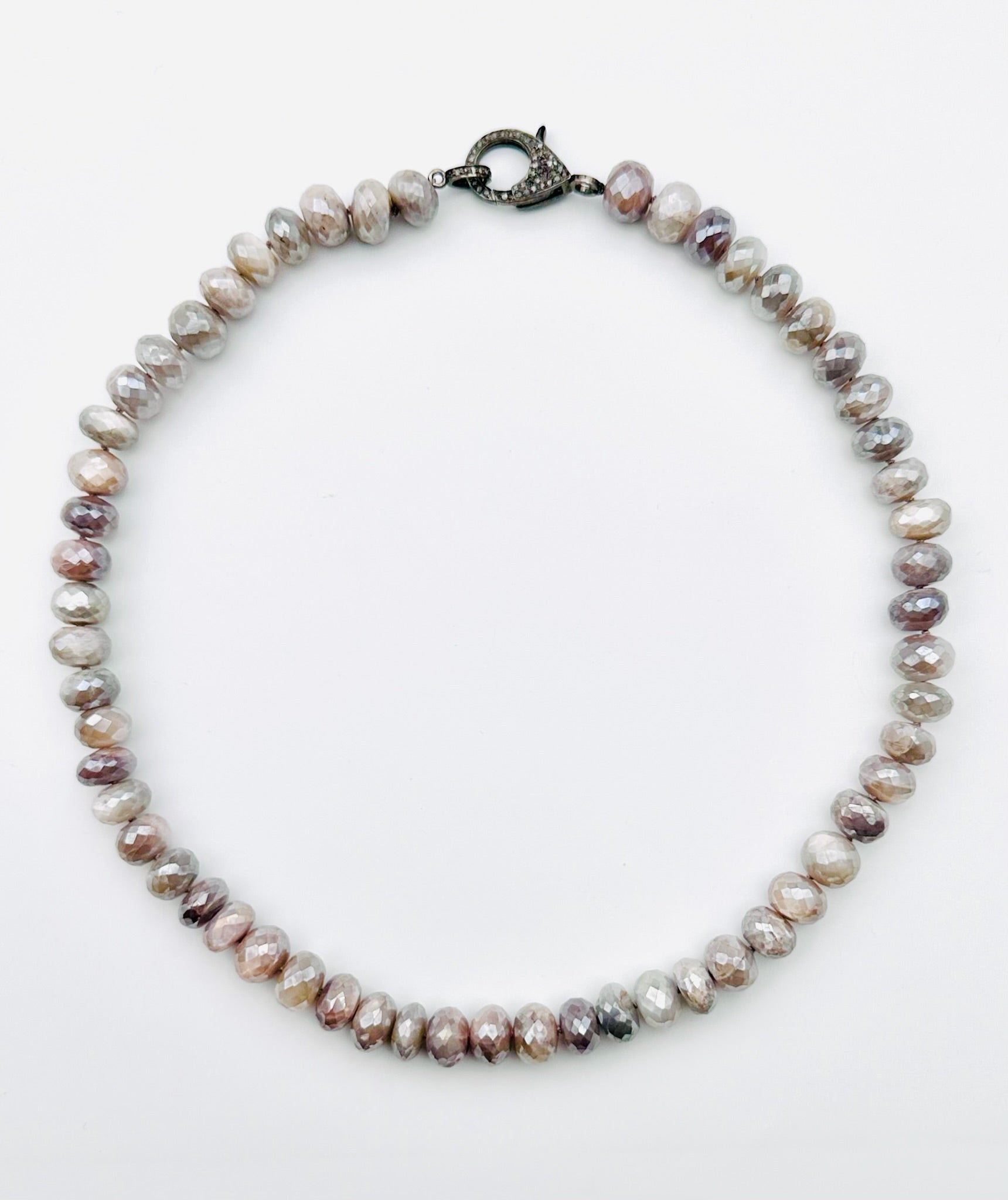 Mystic Grey Moonstone Rondelle Necklace with Sterling Silver Diamond Clasp, 18" length