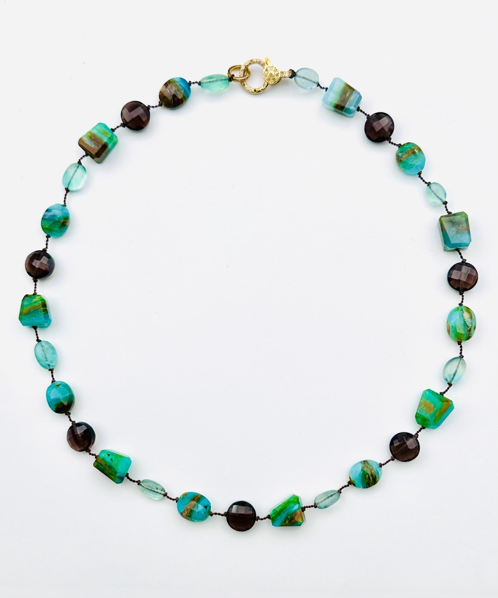 18" Natural Faceted Peruvian Opal Green Fluorite and Smokey Quartz Necklace with Vermeil Diamond Clasp