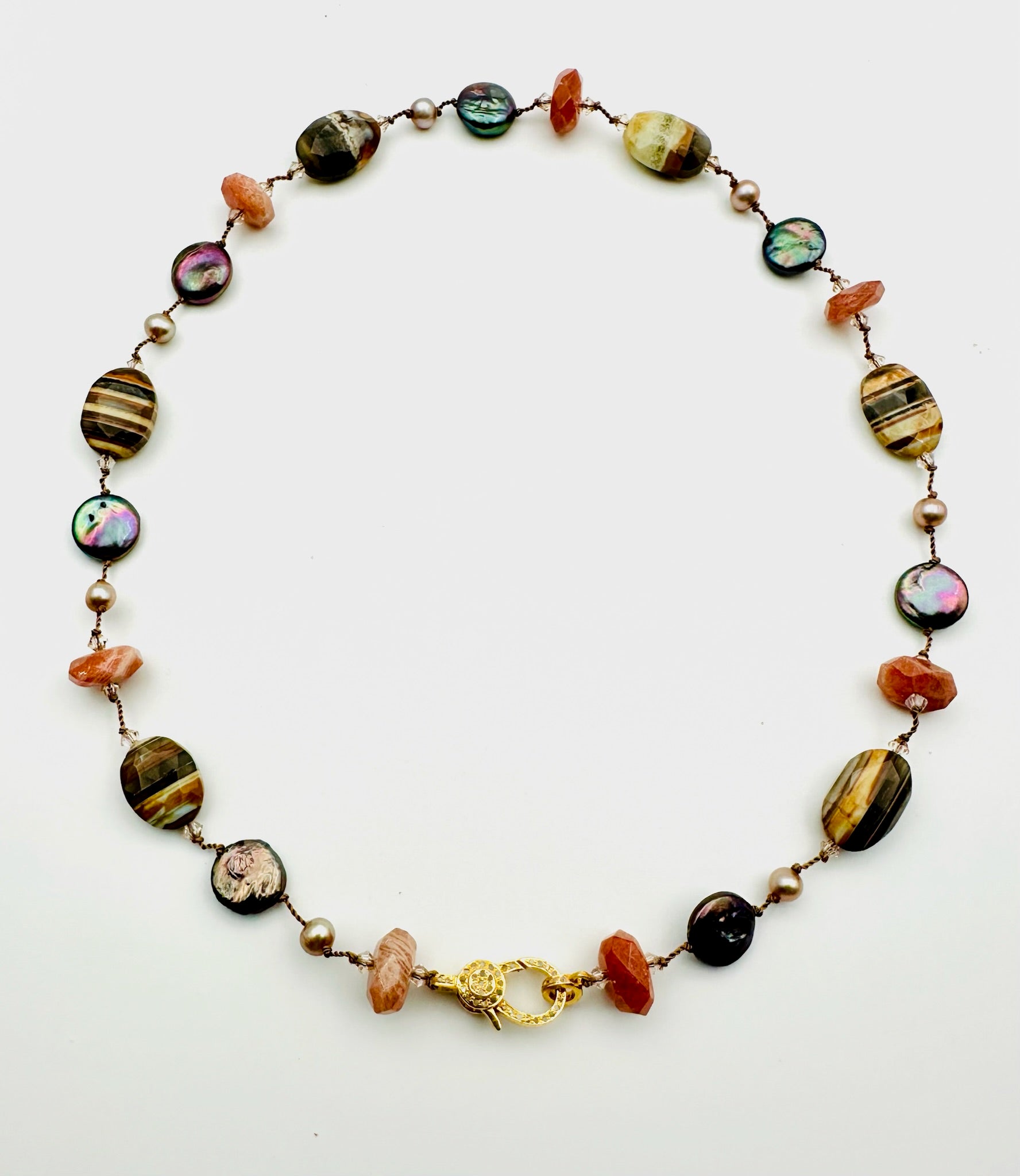 Natural Multi Colored Faceted Opal, Sunstone Rondel, Charcoal Coin Pearl Necklace with Gold Vermeil, 18k/Sterling Silver, Clasp, 18" length