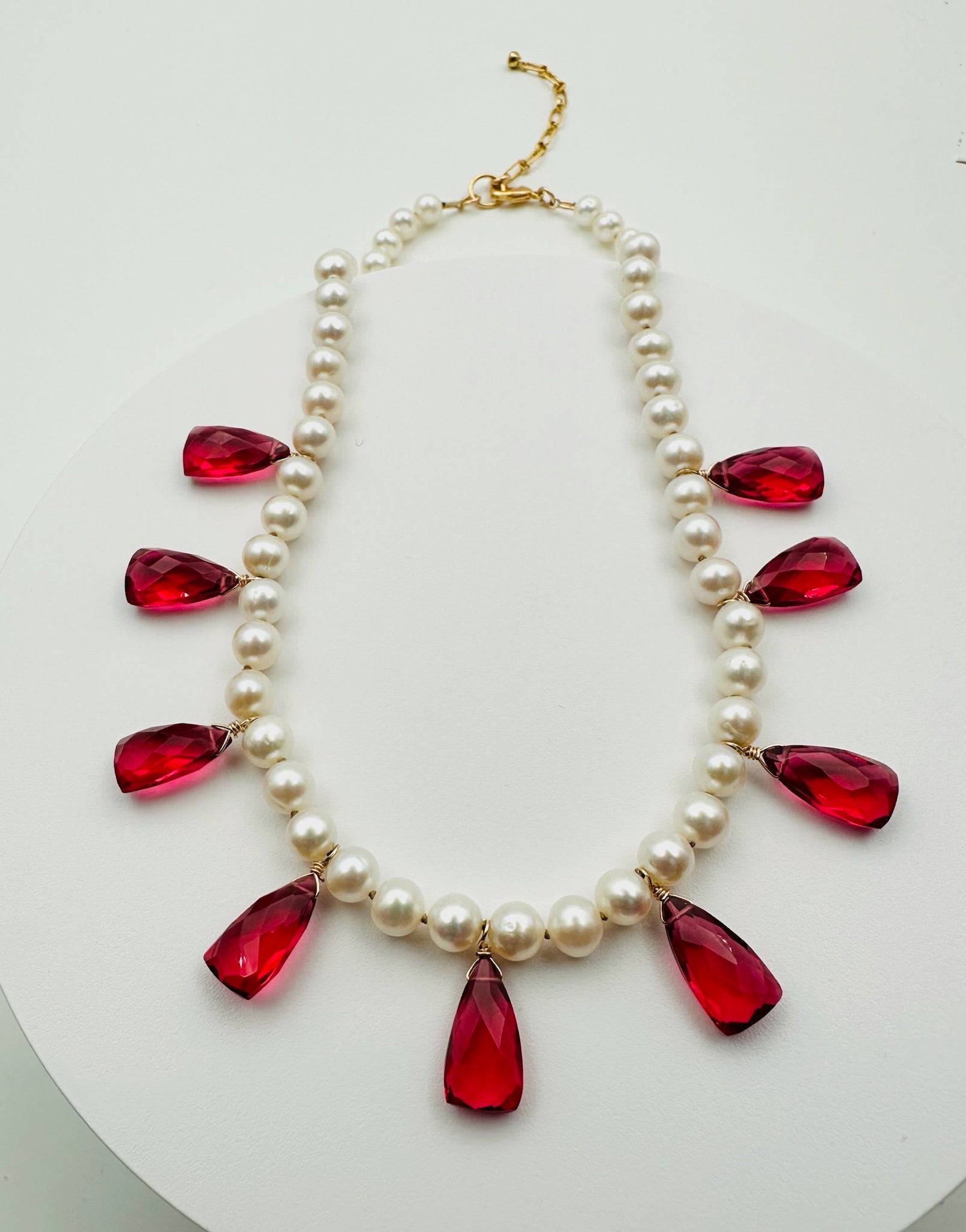Pink Quartz 6mm White Freshwater Pearl Necklace, Gold Fill, 18" length