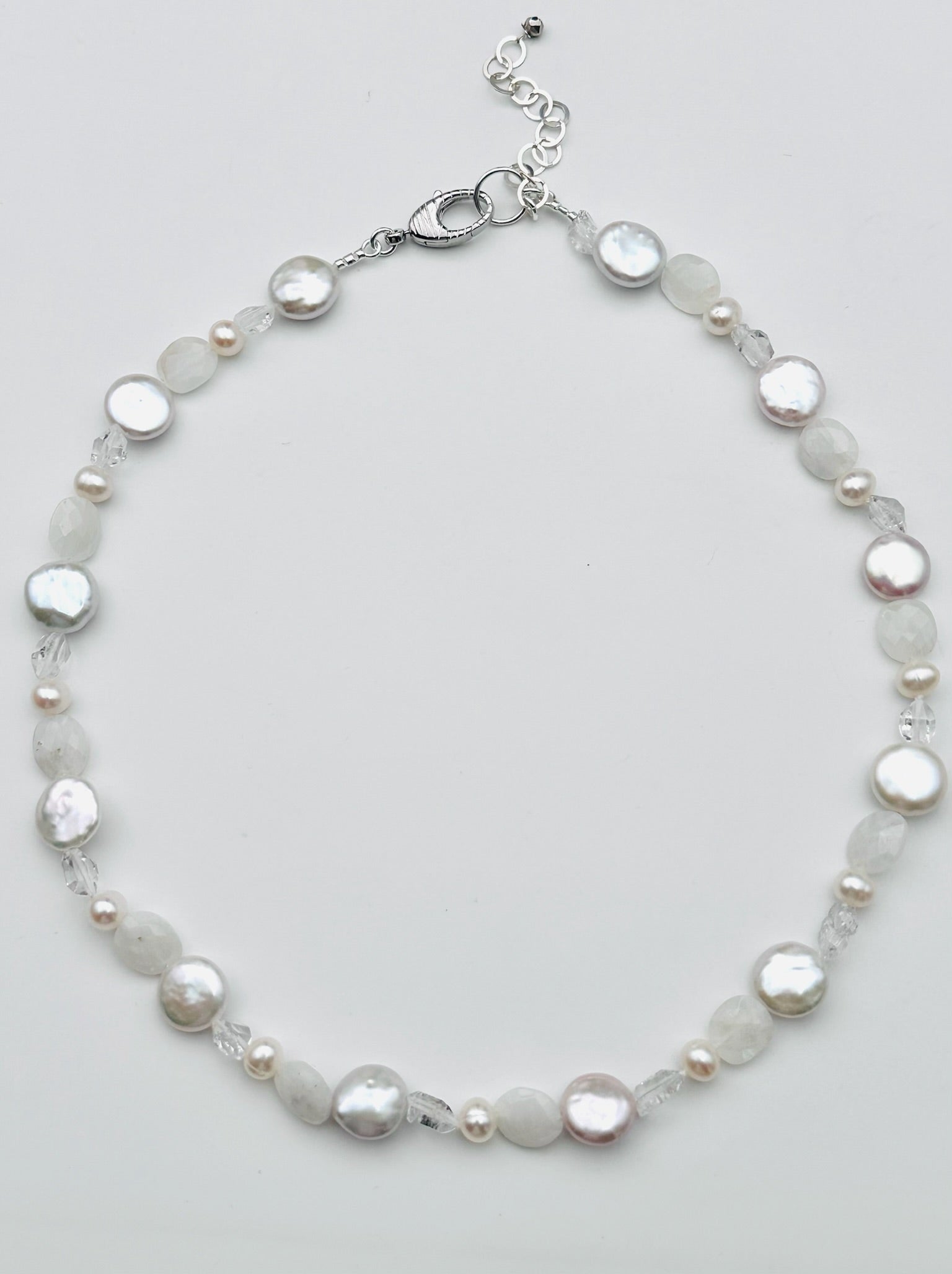 Rainbow Moonstone, Herkimer Diamond and Freshwater Pearl Necklace with Sterling Silver Clasp, 18" length