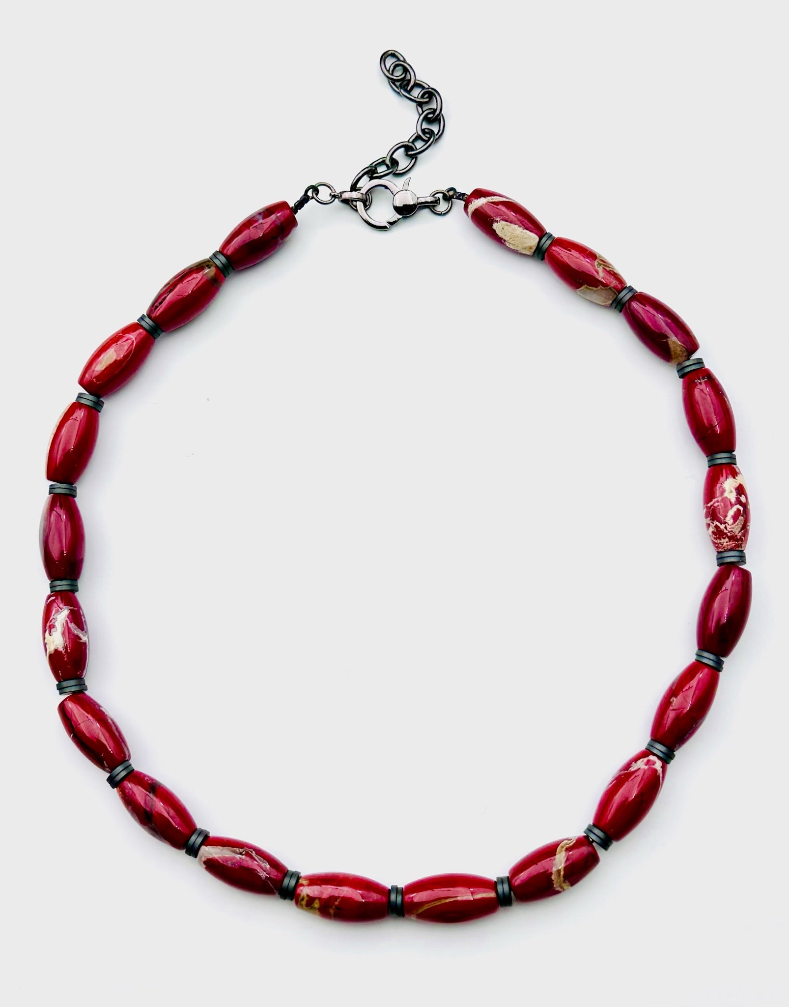 18" Red Jasper Cylinder and Matte Grey Hematite Heishi Necklace