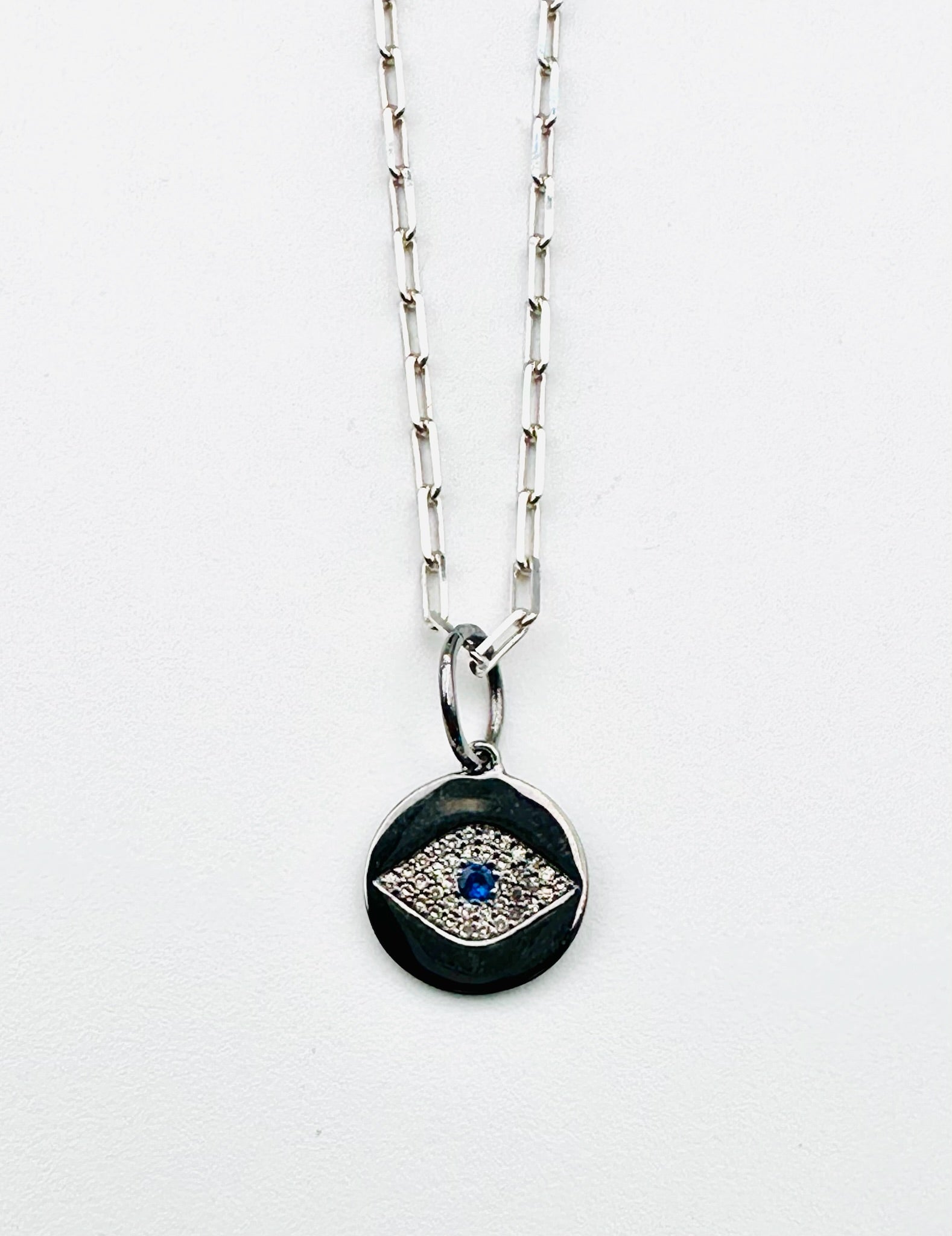 Round Diamond and Blue Sapphire Eye Pendant with Polished Sterling Silver Paper Clip Chain, 18" length