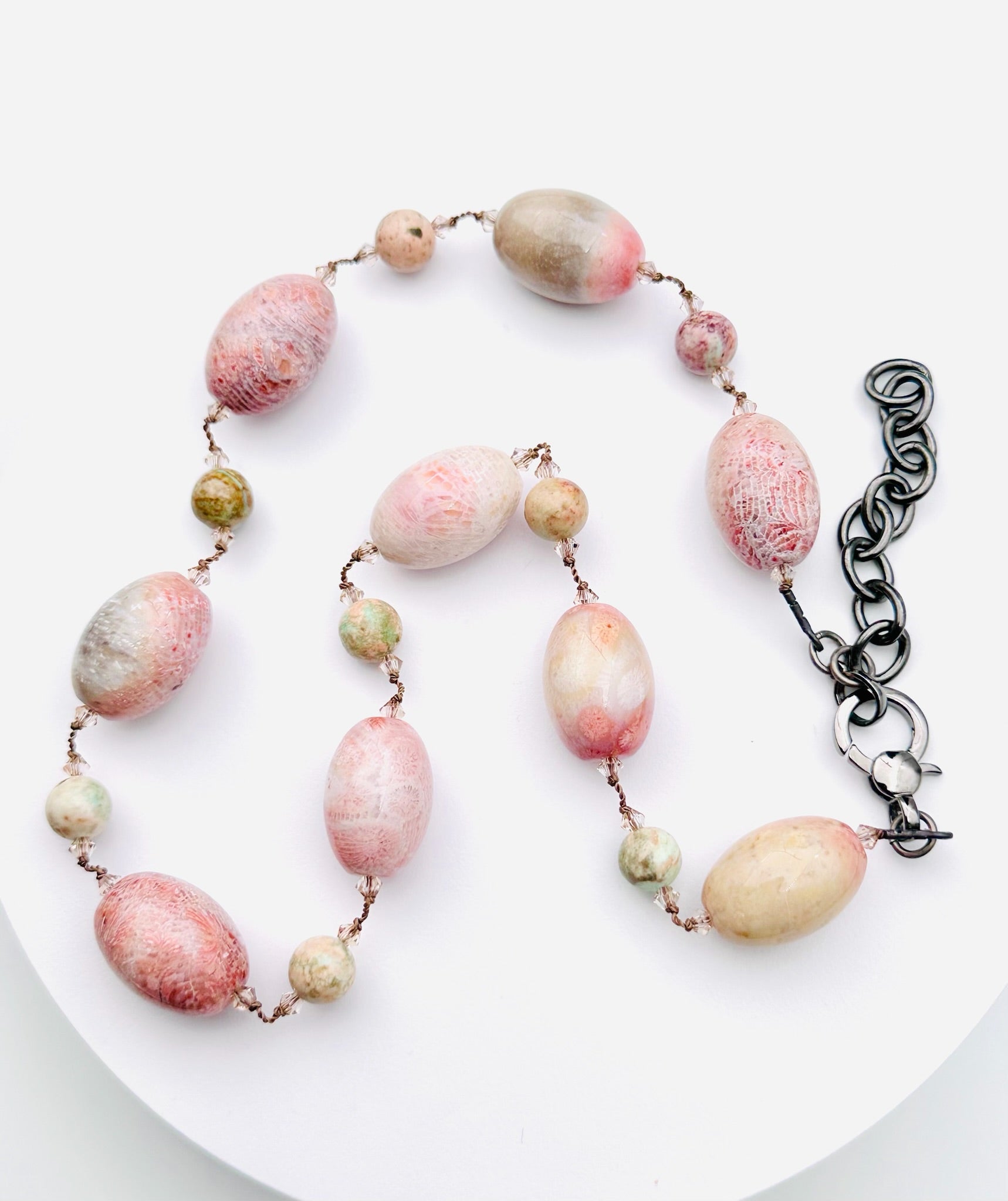 18" Salmon Pink Fossilized Coral and Natural Peruvian Turquoise Ball Necklace