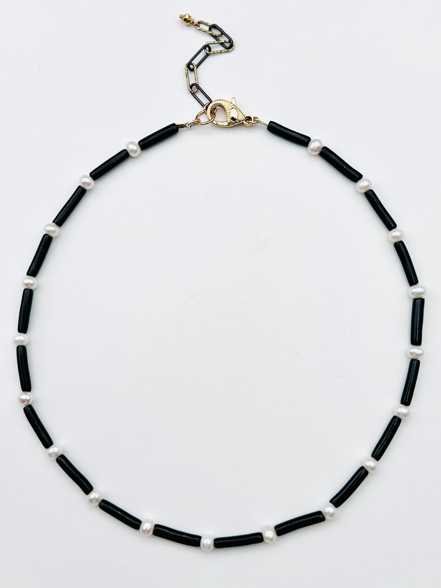 Tube Shaped Black Coral and Freshwater Pearl Necklace with Gold Fill Clasp, 18" length
