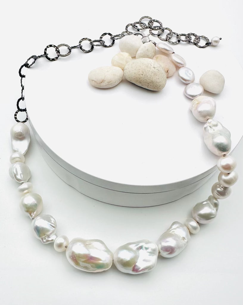 White Freshwater Baroque, Coin and Edison Pearl Adjustable Necklace with a Hammered Sterling Silver Rhodium Chain, 15" length - 18" length