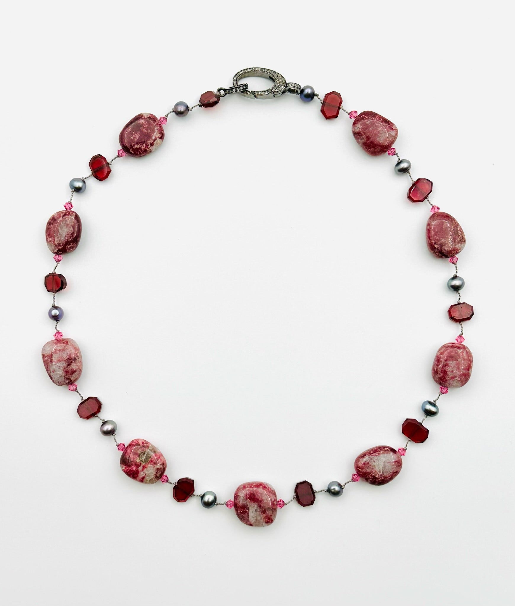 Thiulite, Red Garnet, and 4mm Peacock Freshwater Pearl Necklace with Sterling Silver Diamond Clasp, 18" length