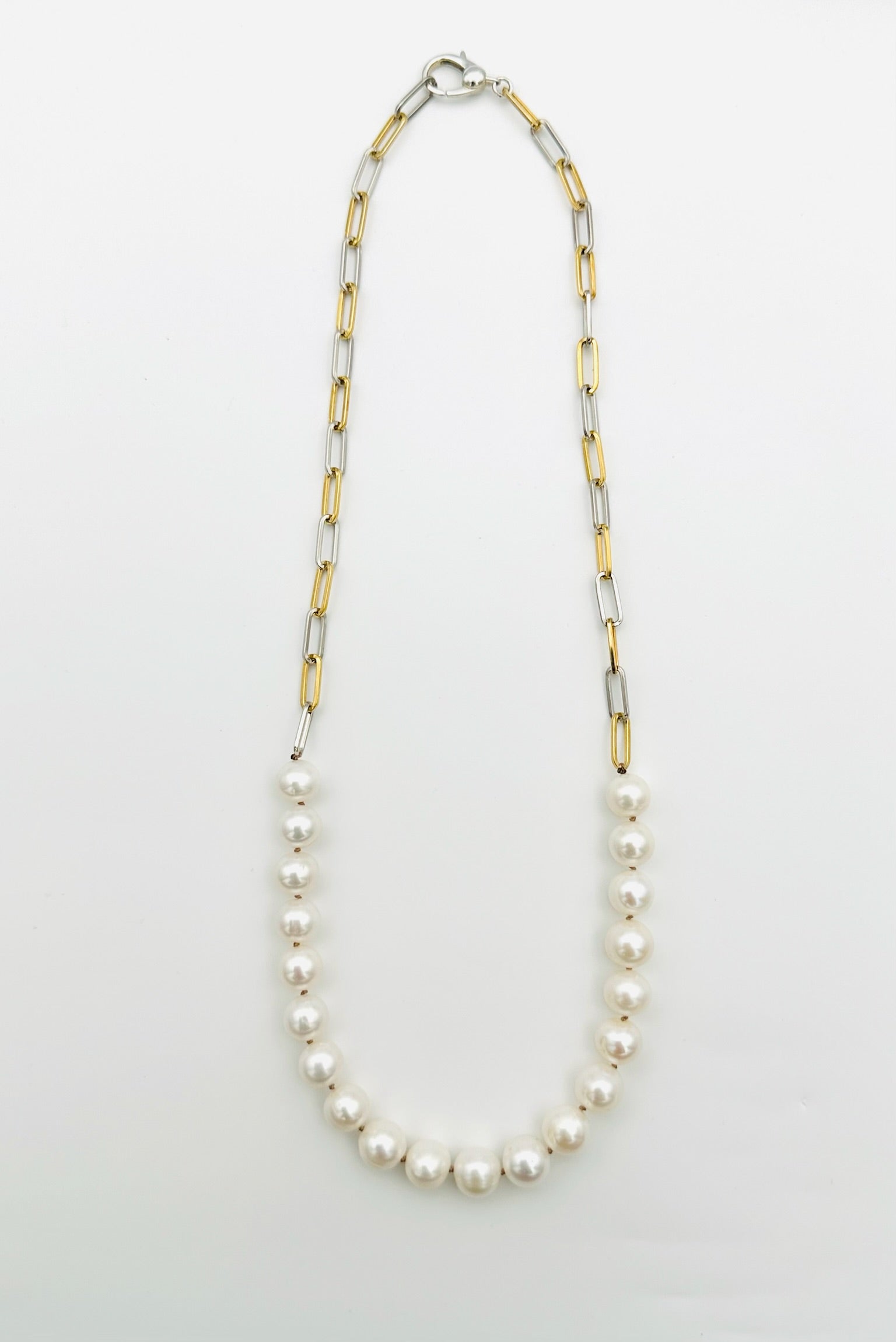21" 10mm Freshwater Pearl Necklace with Two Tone Paperclip Chain and Gold Vermeil Clasp