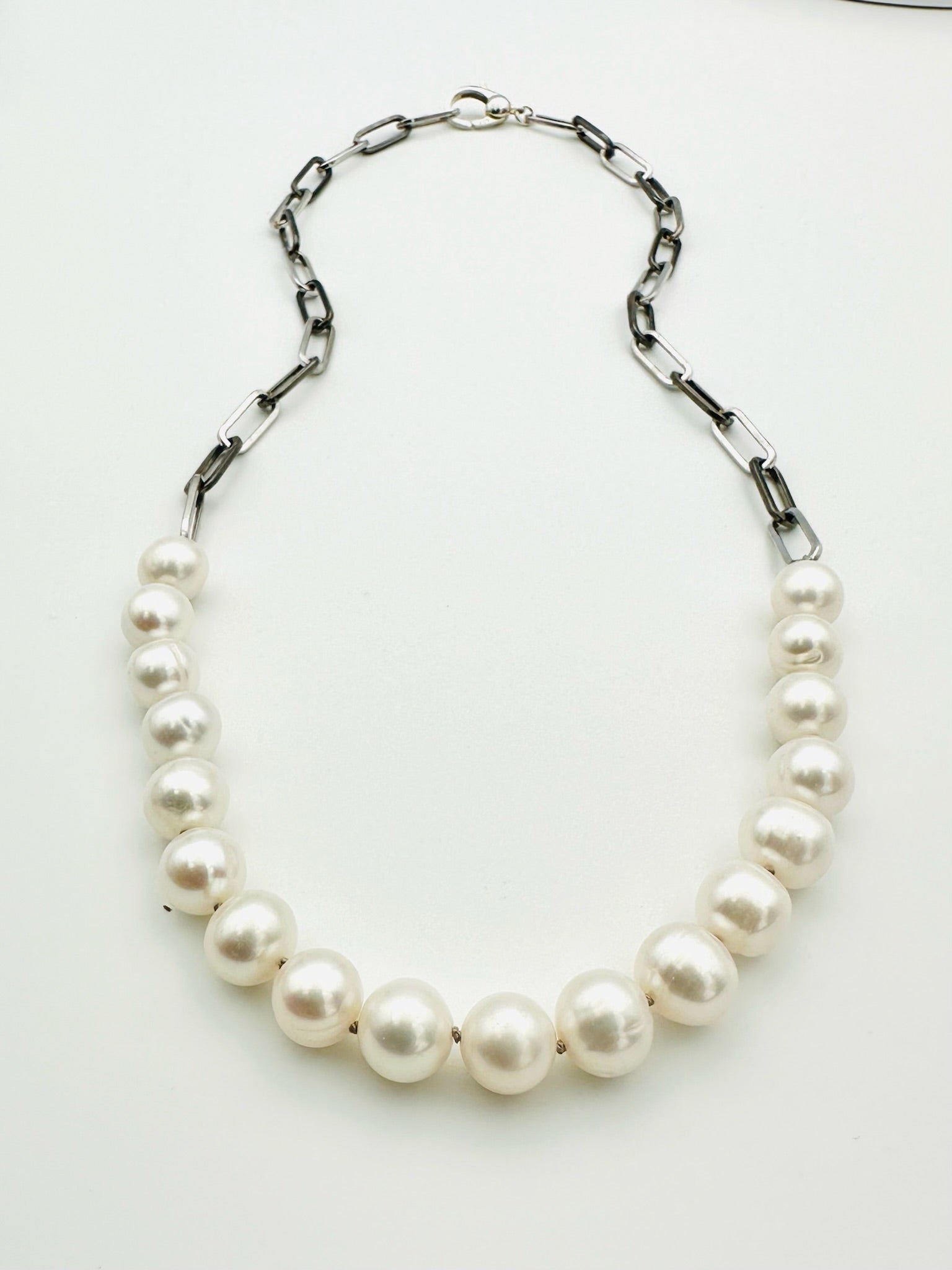 21" 10mm Freshwater Pearl Necklace with Two Tone Rhodium and Sterling Silver Paperclip Chain