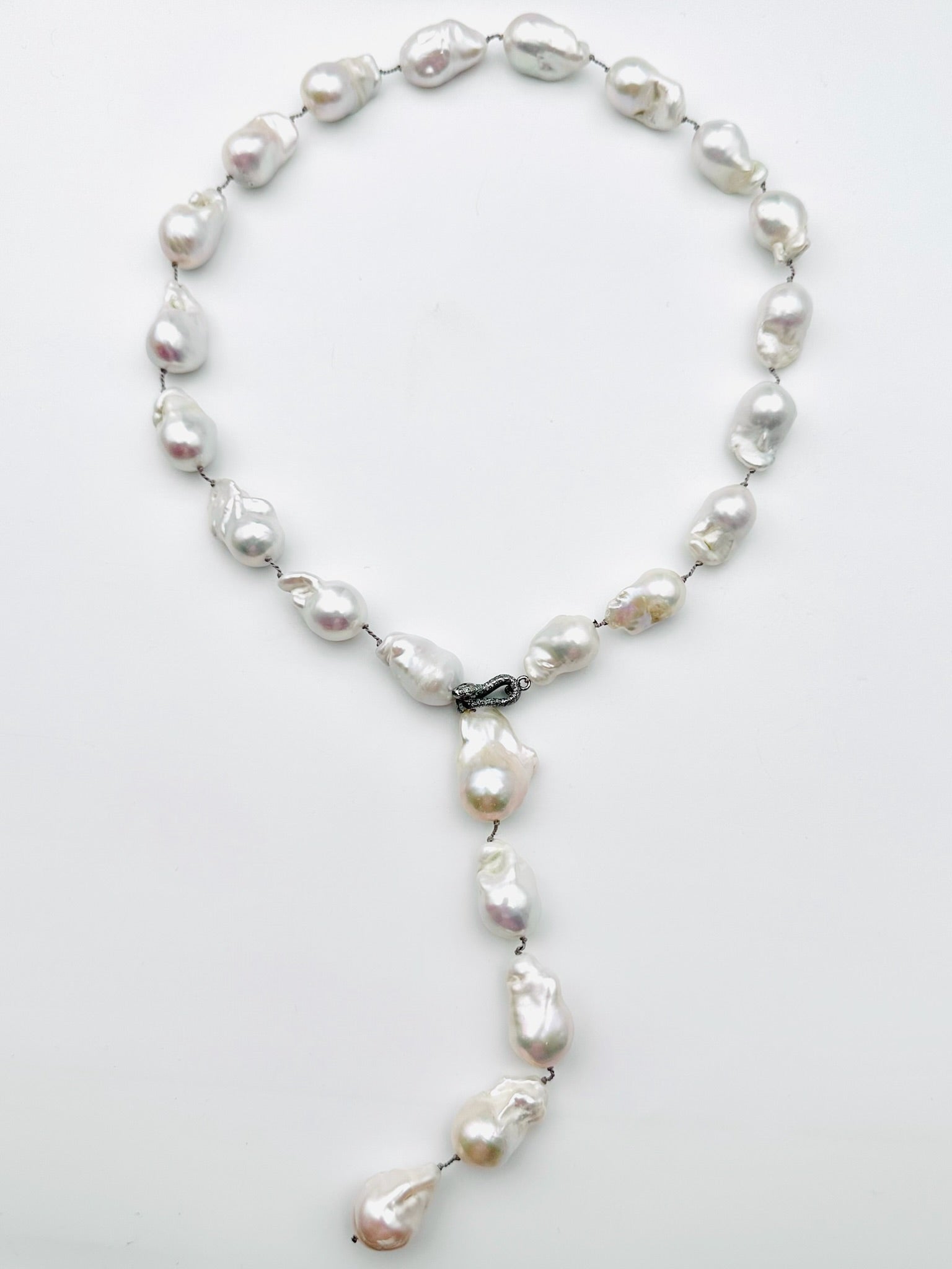 Medium and Large Freshwater White Baroque Pearl Lariat with Sterling Silver Diamond Clasp, 24" length