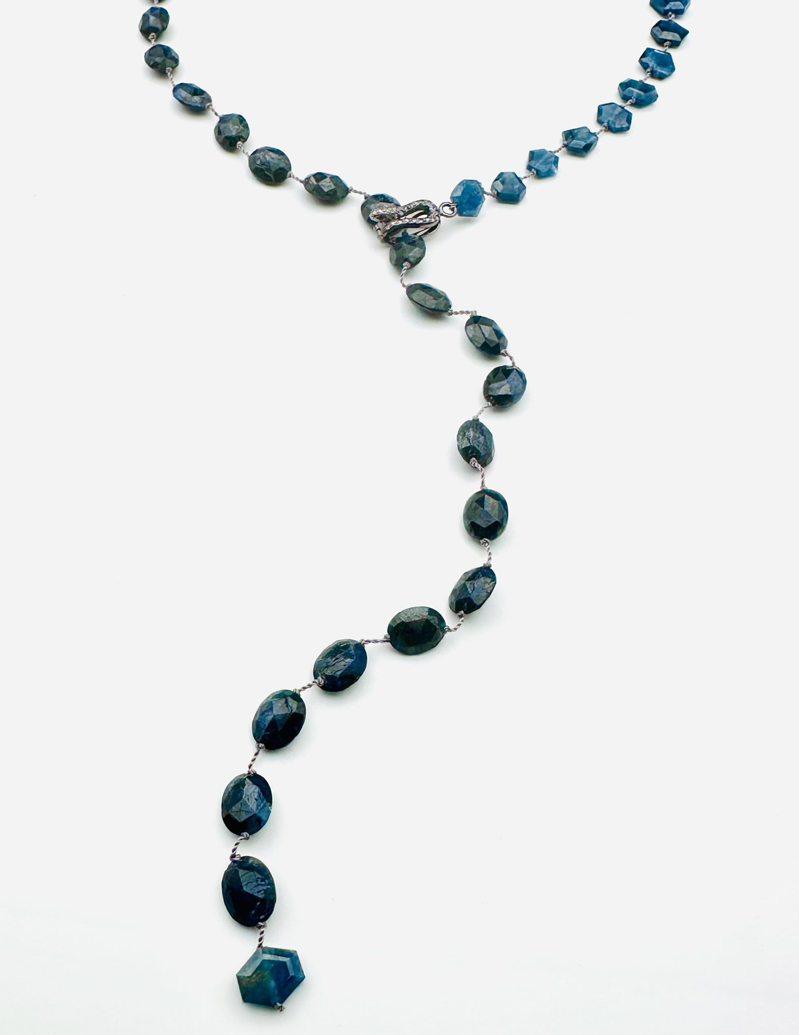 Natural Faceted Blue Sapphire Mixed Shapes Lariat with Diamond Sterling Silver Clasp, 24" length