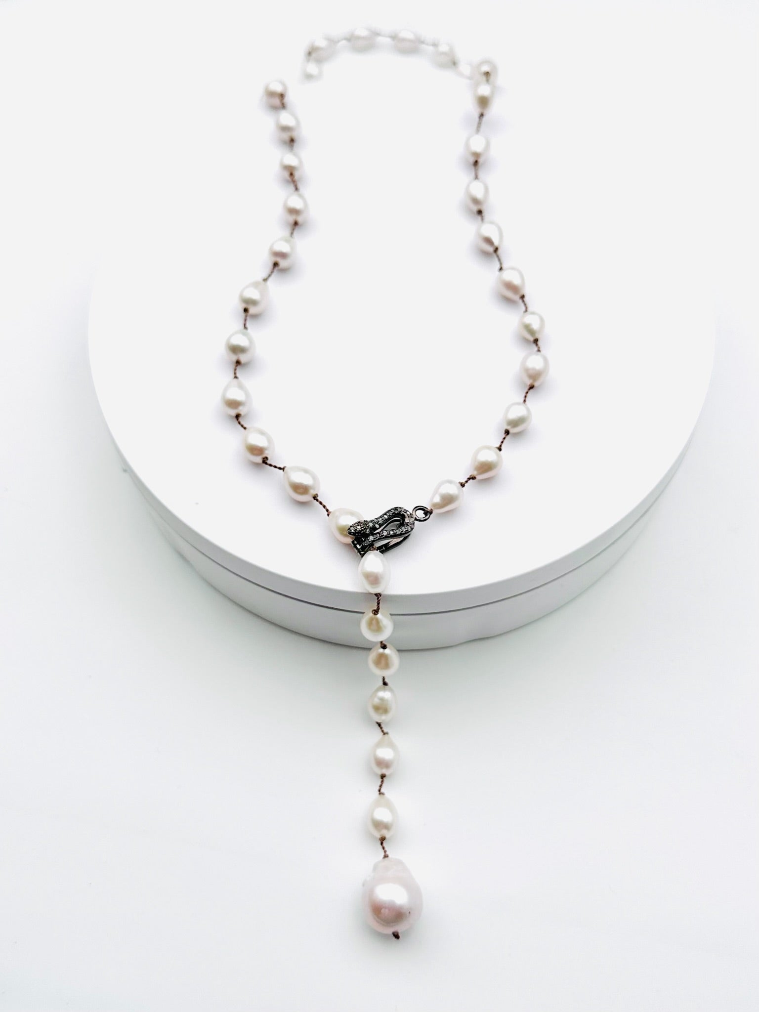 Small 6-7mm White Freshwater, Baroque Pearl Lariat with Diamond Clasp, 24" length
