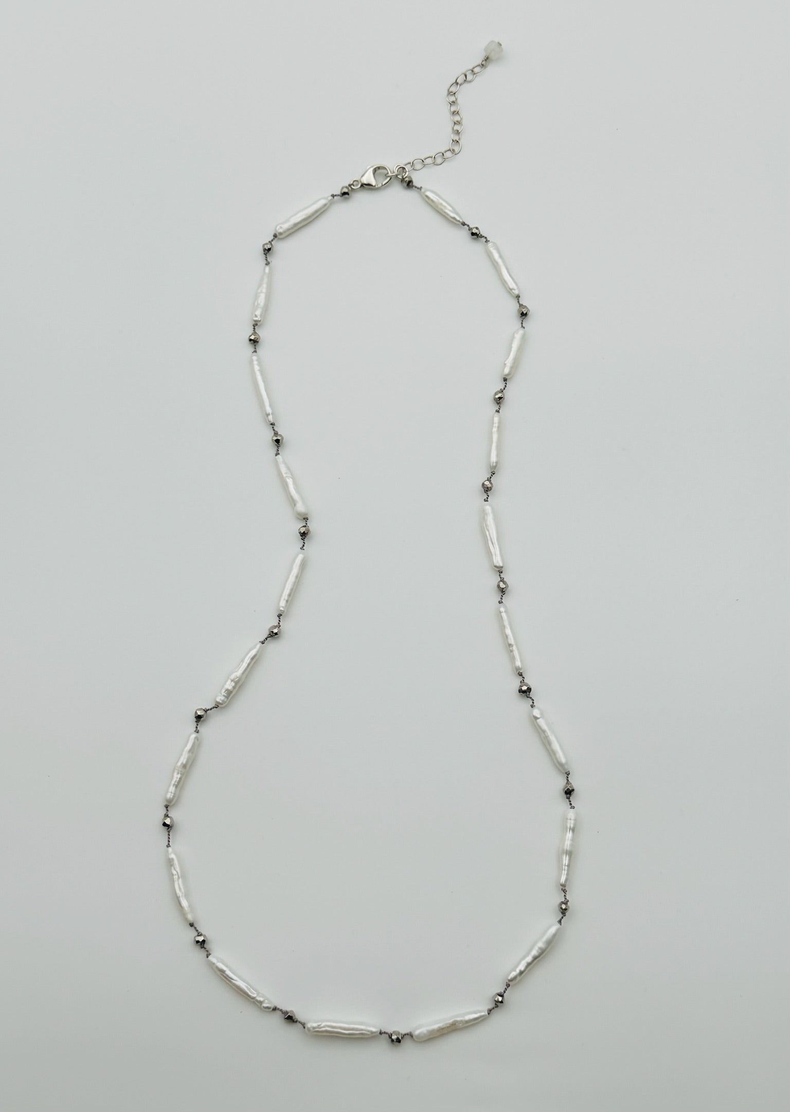 Stick Pearl and Pyrite Bead Necklace with Sterling Silver Clasp, 24" Length+ 2" Extension Chain