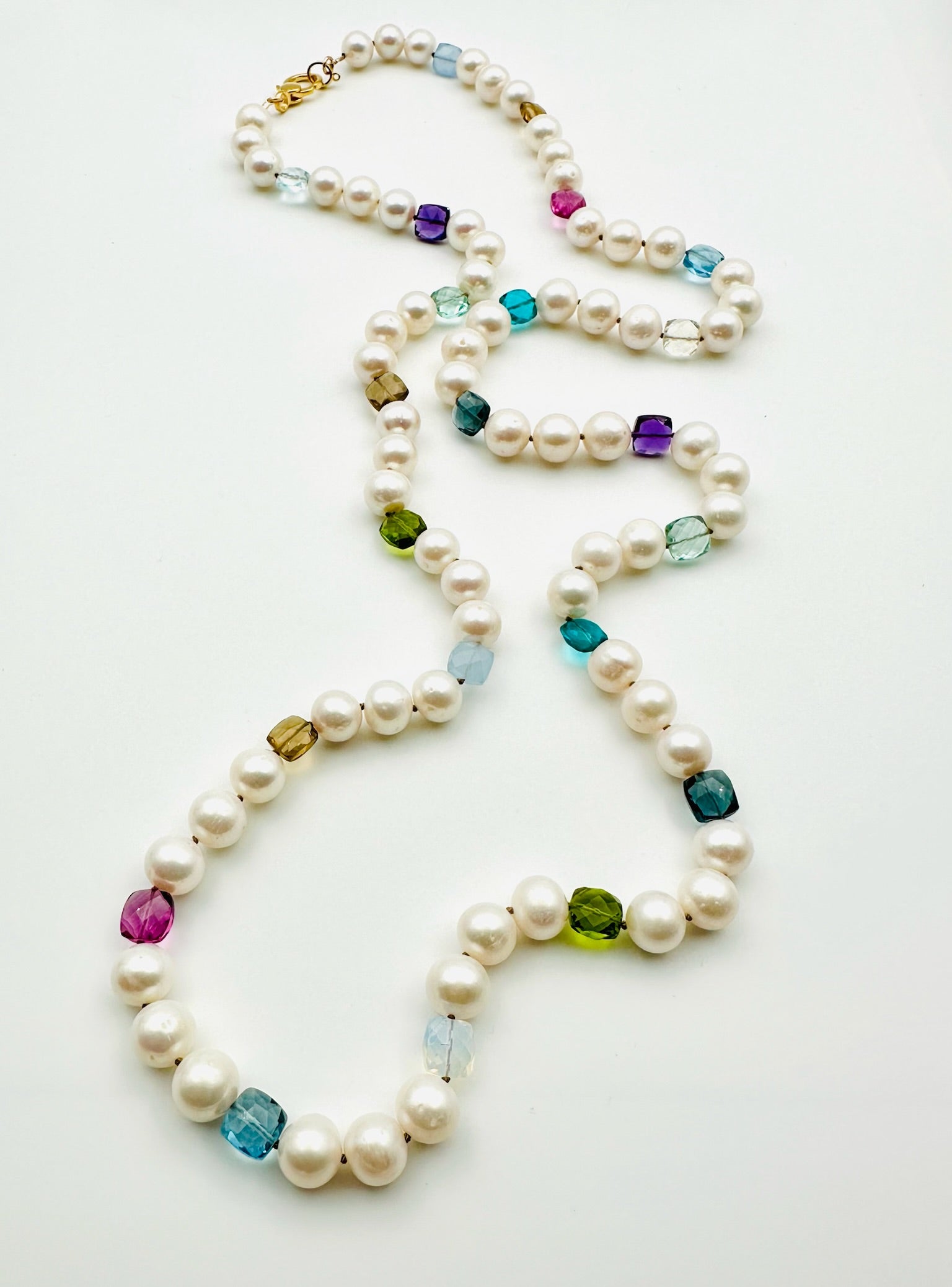 10mm Round Freshwater Pearl Mixed Cushion Cut Multi Color Quartz Necklace, Gold Vermeil, 18k/Sterling Silver, Clasp, 36" length