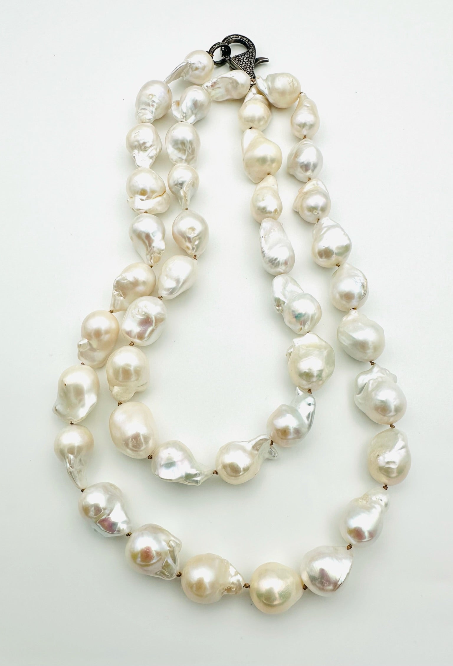 36" 14-16mm Large White Baroque Freshwater Pearl Necklace with No Spacing and Large Diamond Sterling Silver Clasp