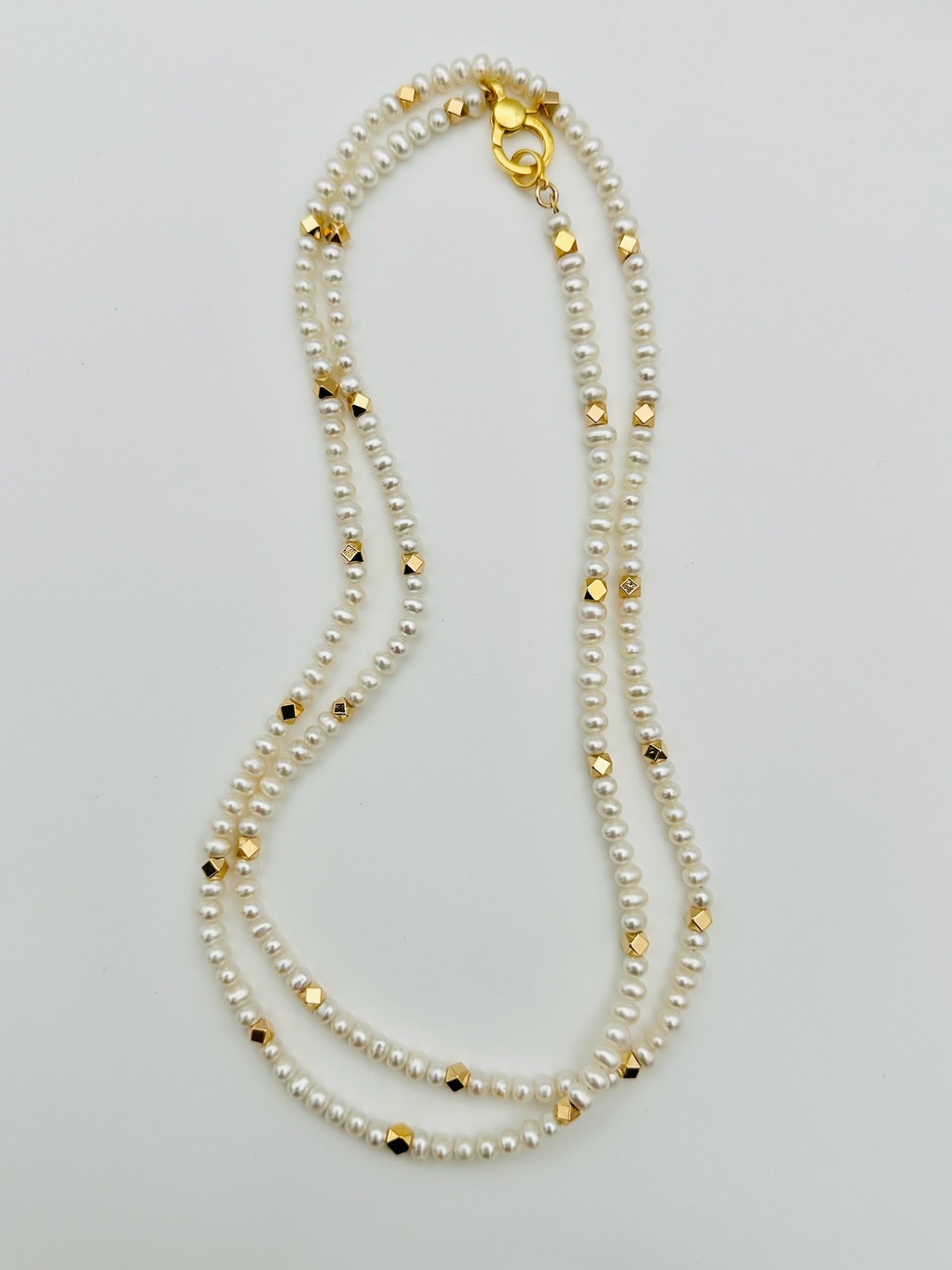 36" 4mm Freshwater Pearl and Faceted Gold Filled Ball Necklace