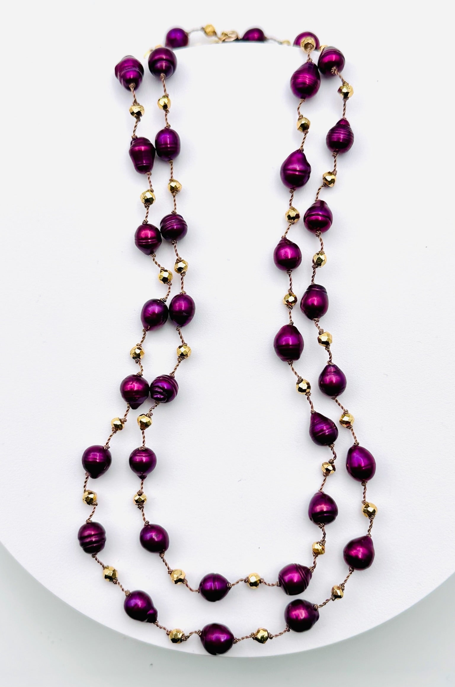 36" Extra Small Burgandy Freshwater Baroque Pearl and Gold Pyrite Necklace with Vermeil Clasp