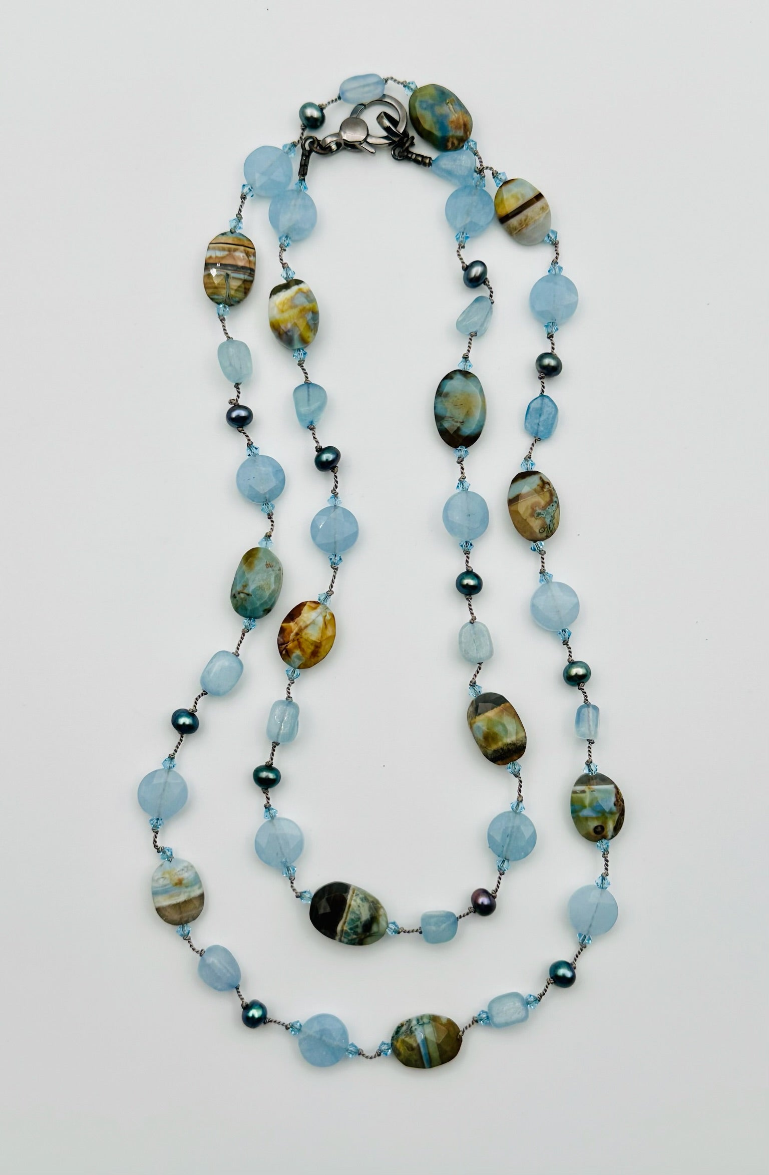 Faceted Natural Opal, Aquamarine and Peacock 4mm Freshwater Pearl Combination Necklace, with Rhodium Clasp, 36" length